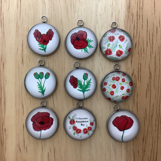 Poppy Flower Glass Cabochon Charms, November 11th, Day of Remembrance Charms
