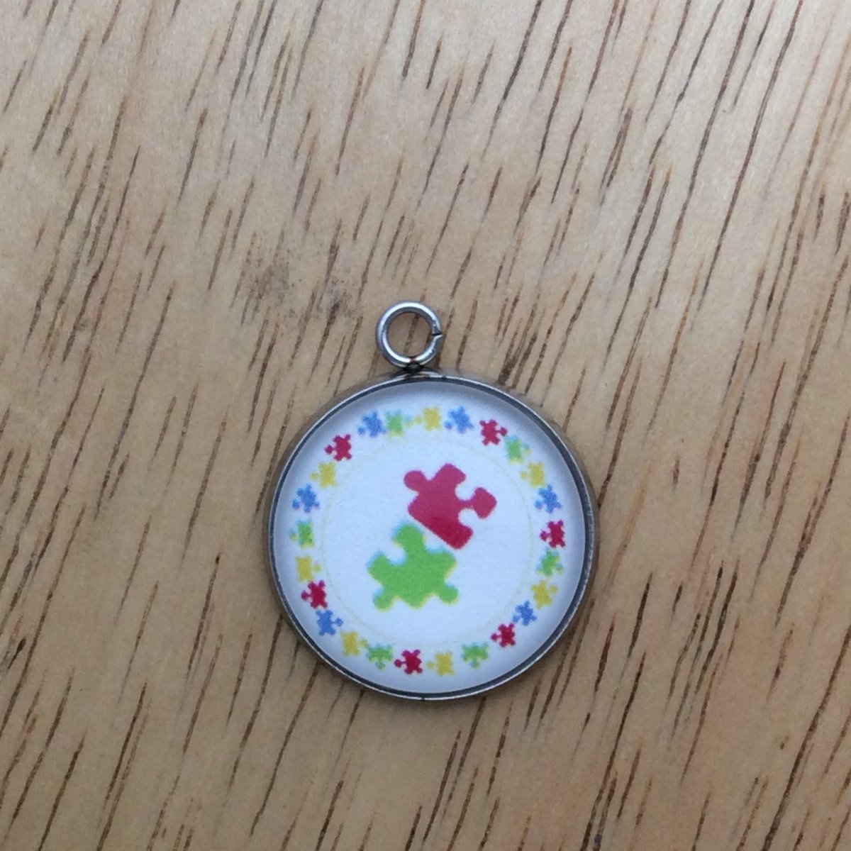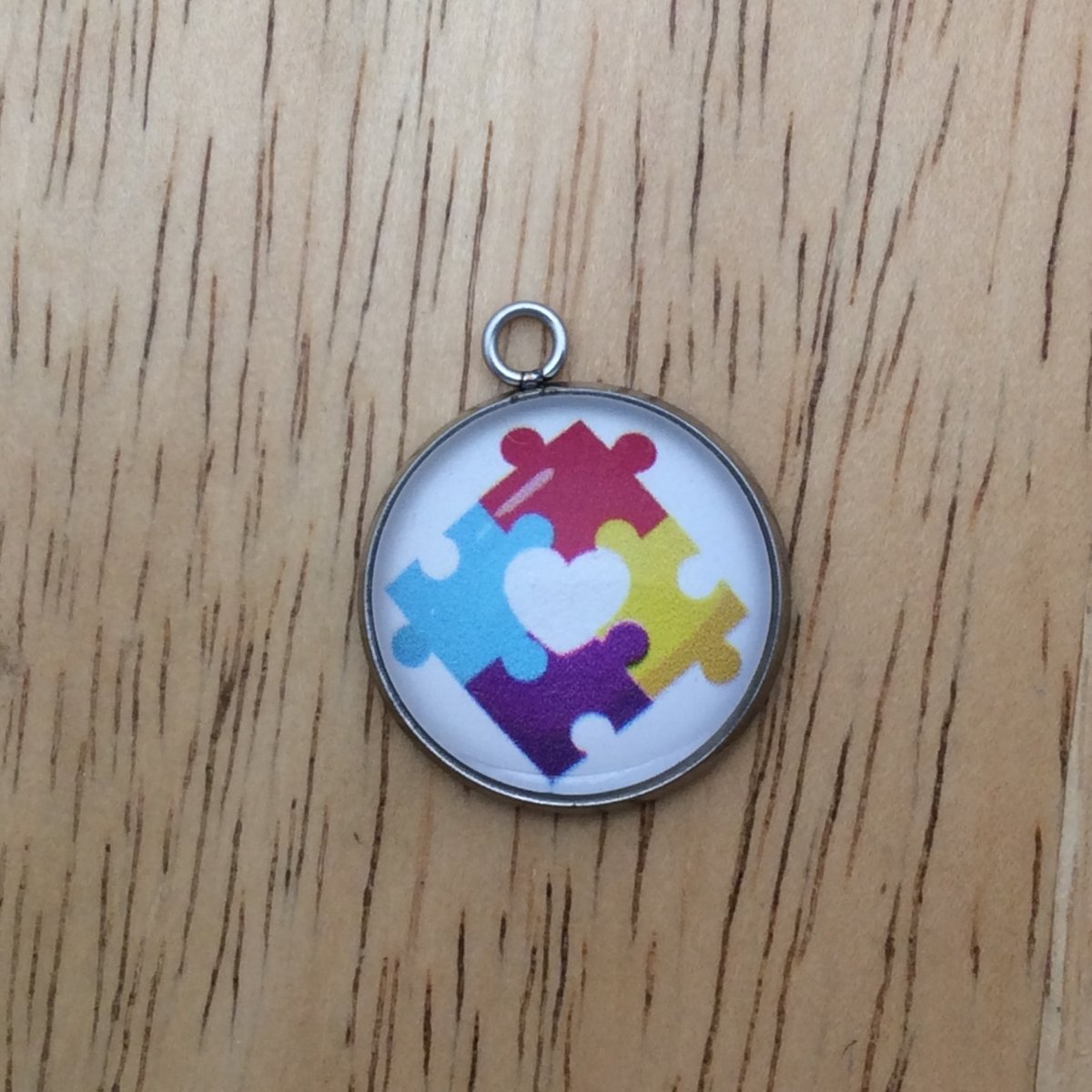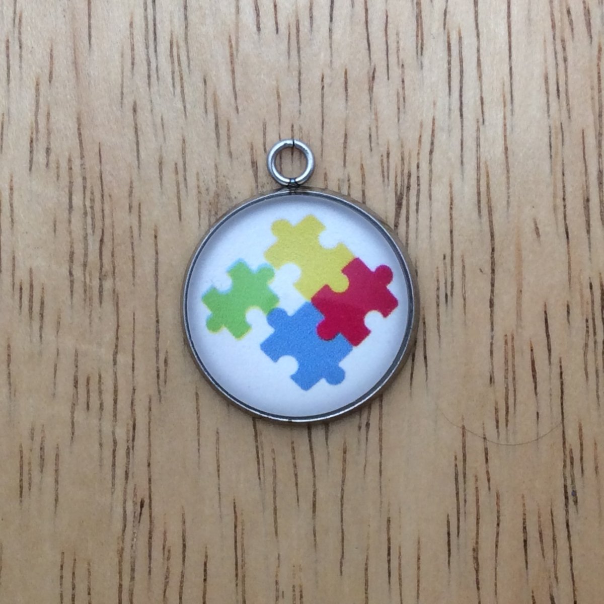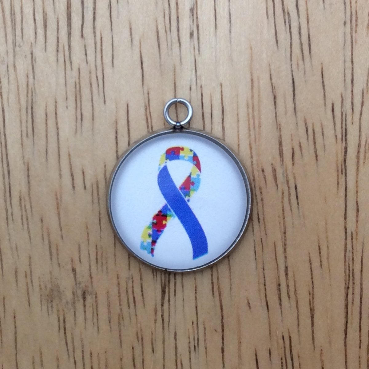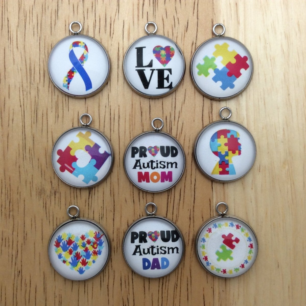 At I Like Worms, We make our Autism charms with glass cabochons and they are set in a stainless steel base. We make these Charms and pendants in three different sizes.