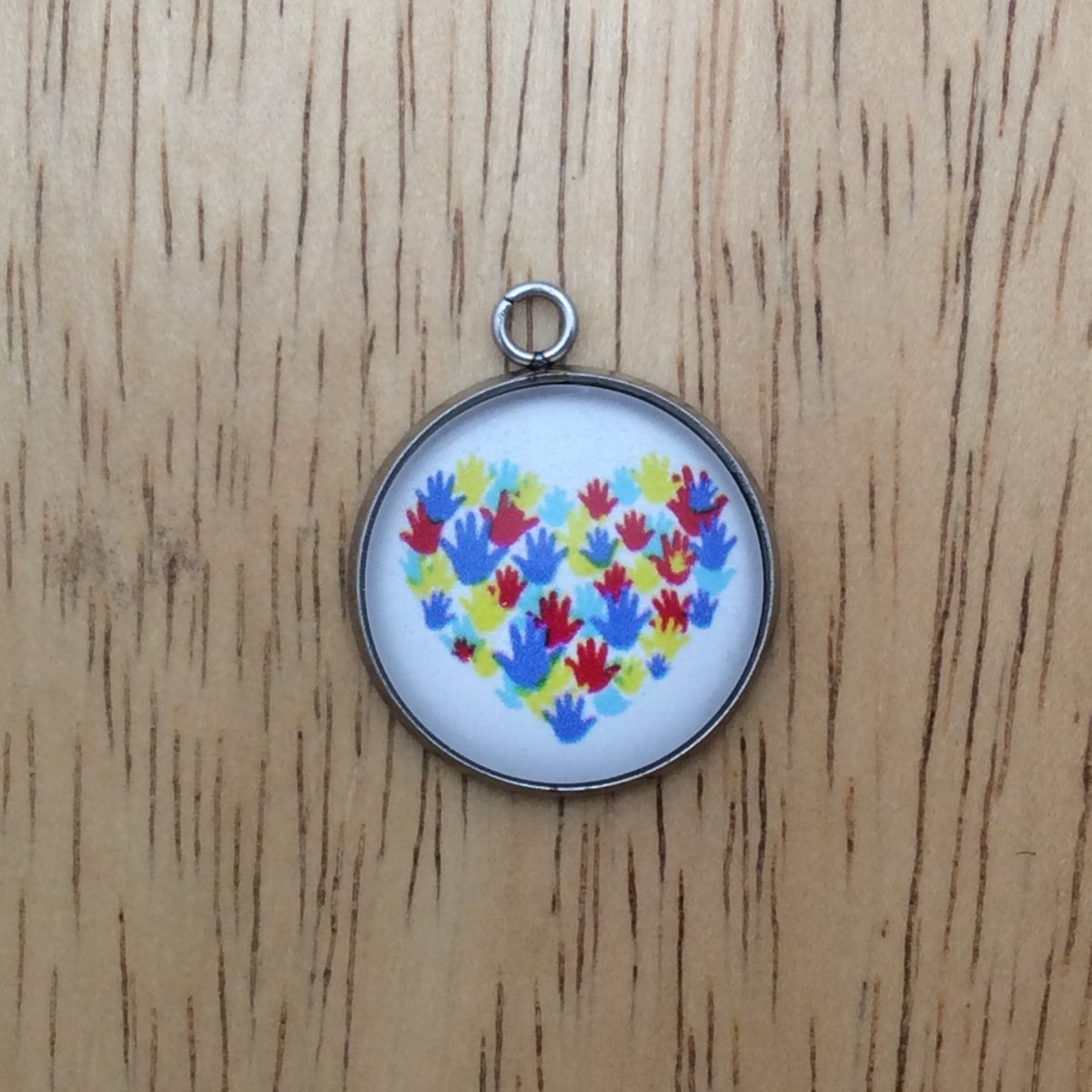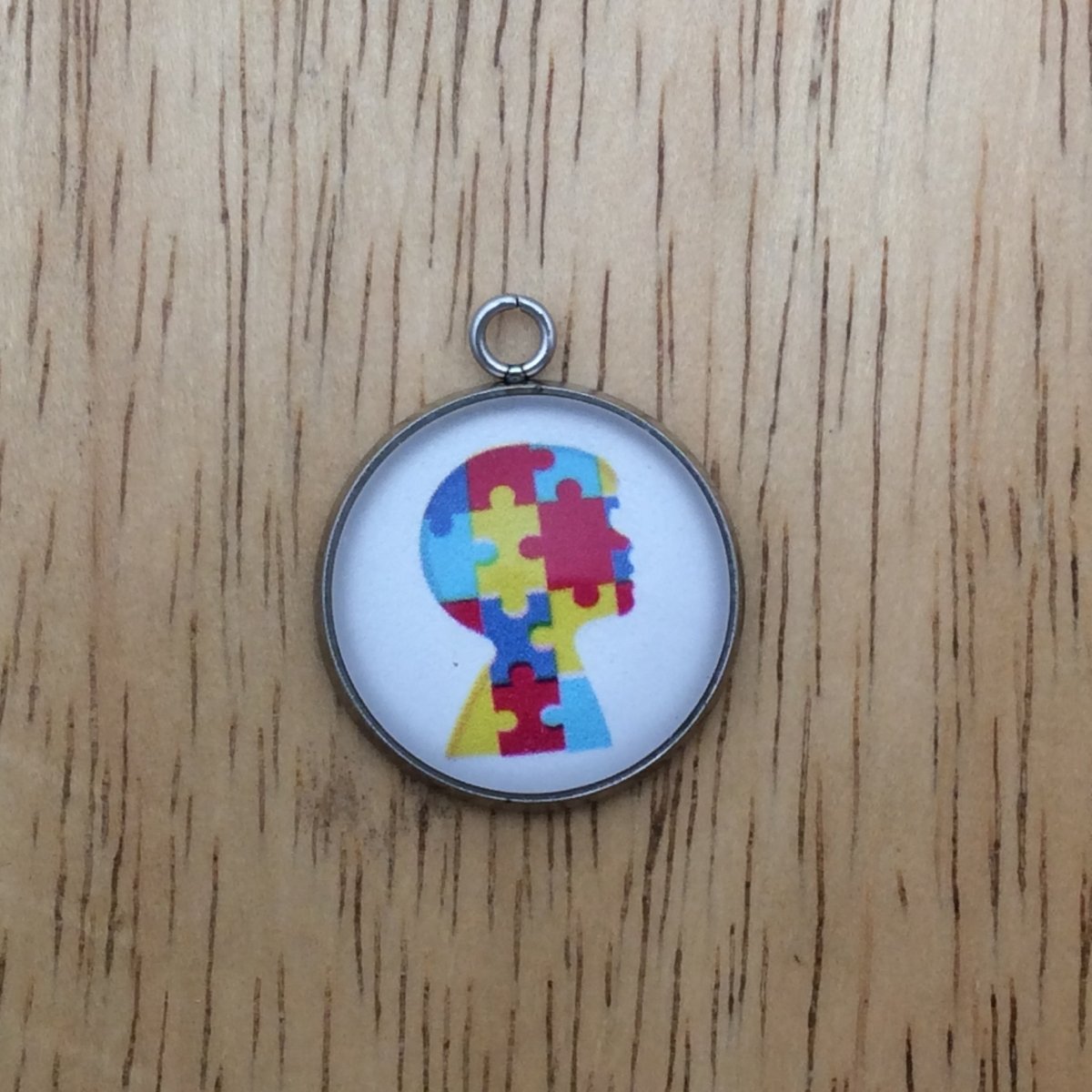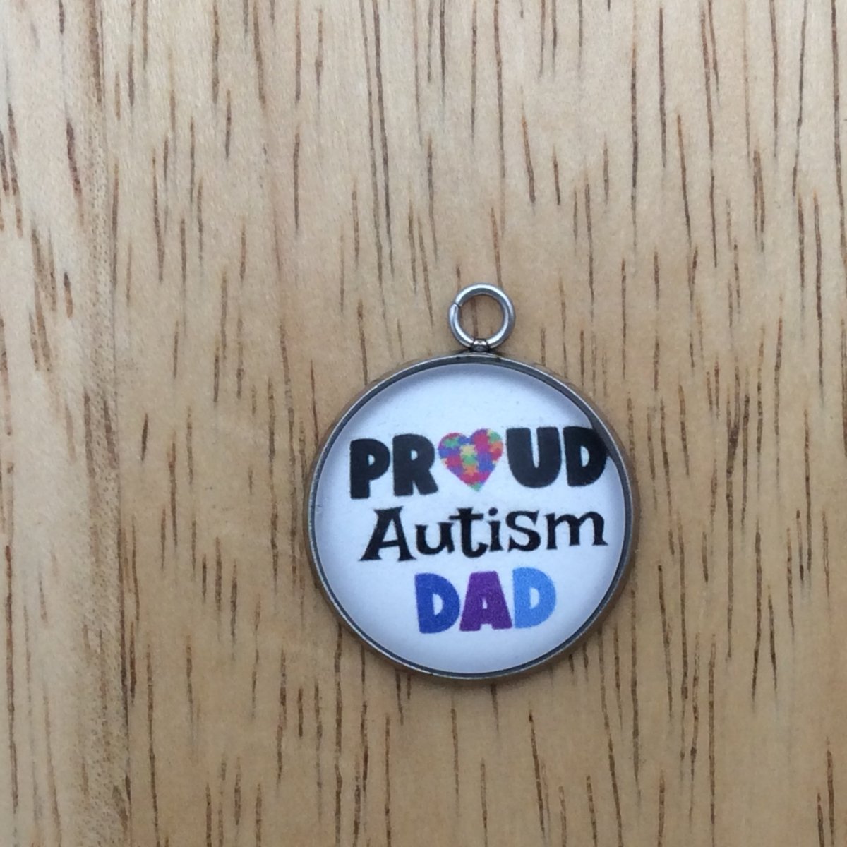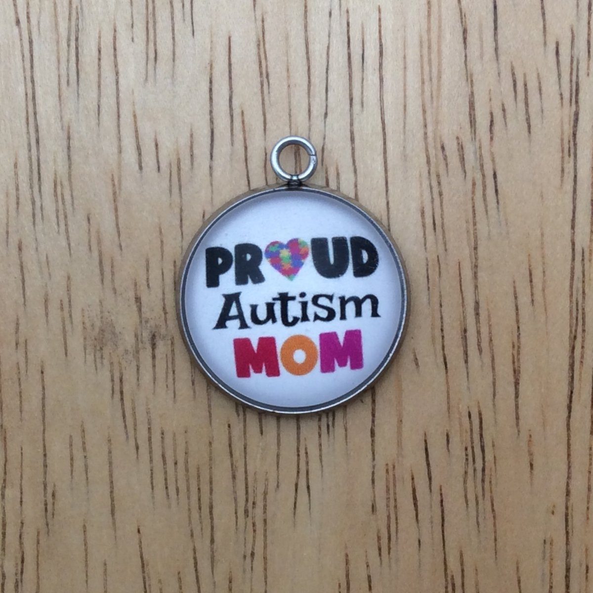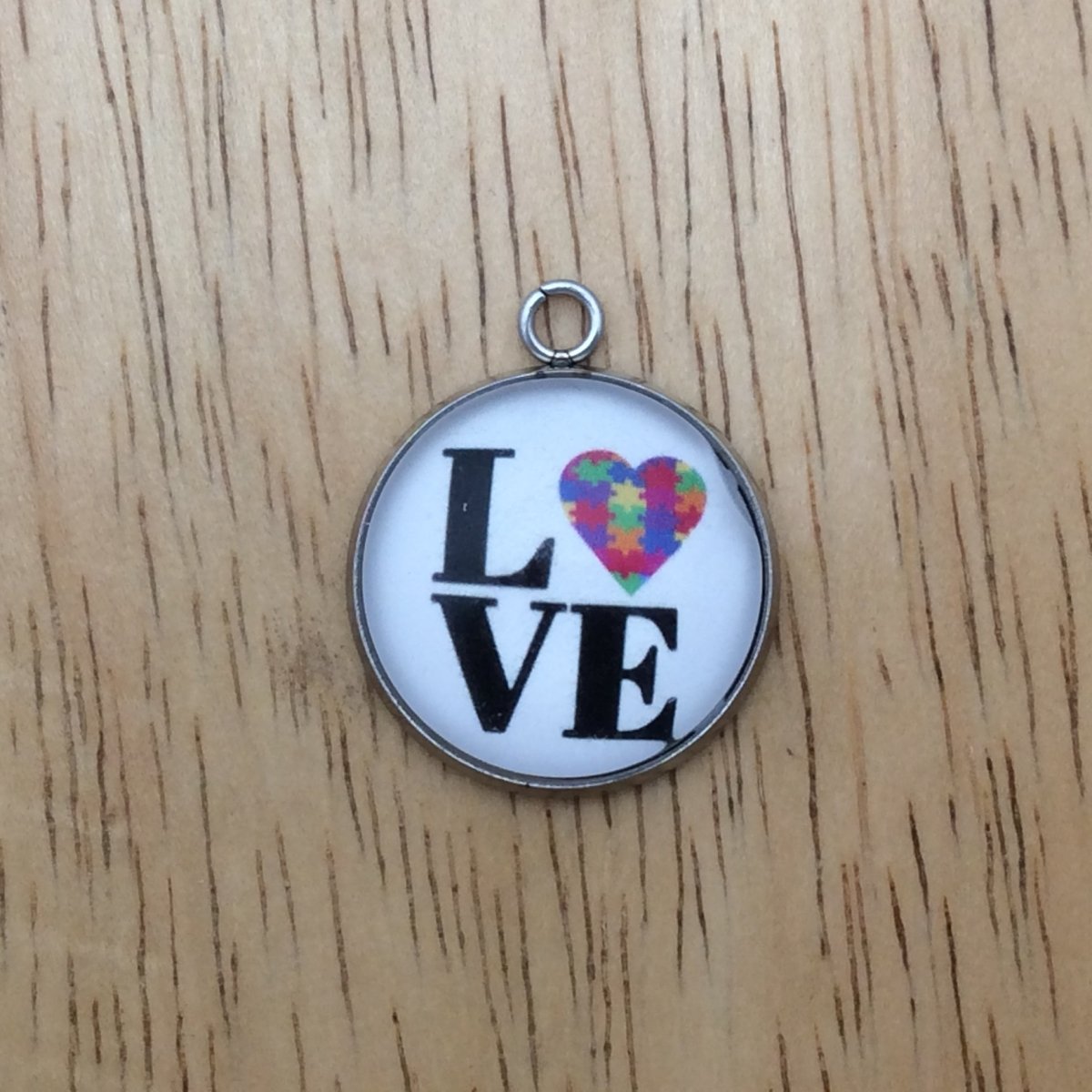 At I Like Worms, We make our Autism charms with glass cabochons and they are set in a stainless steel base. We make these Charms and pendants in three different sizes.