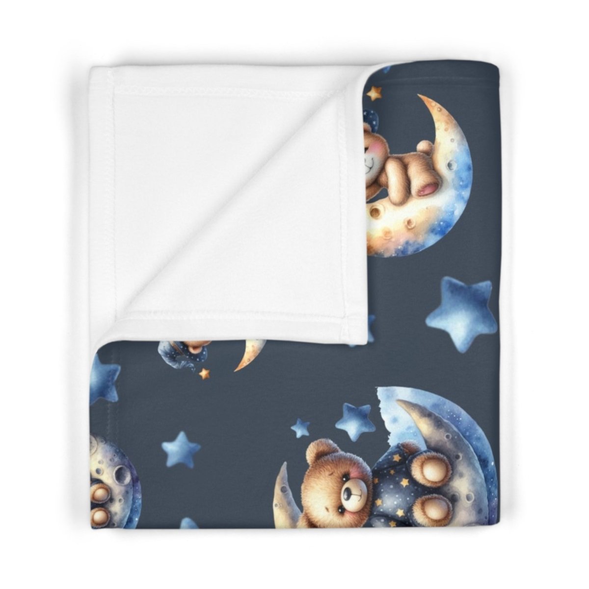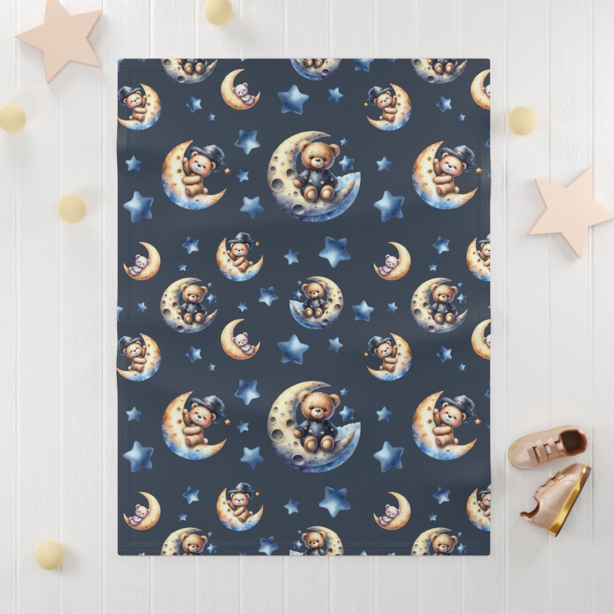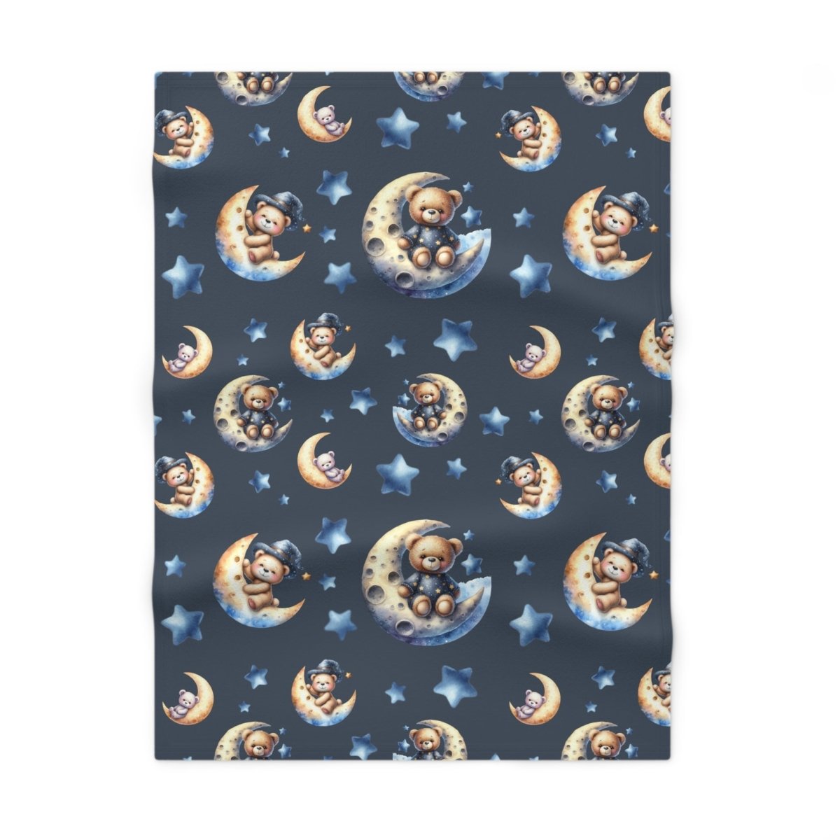 This soft fleece Baby Blanket featuring cute bears on crescent moons is perfect for keeping your little one cozy and comfortable. Ideal for nursery decor, baby showers, and gifting to new parents.