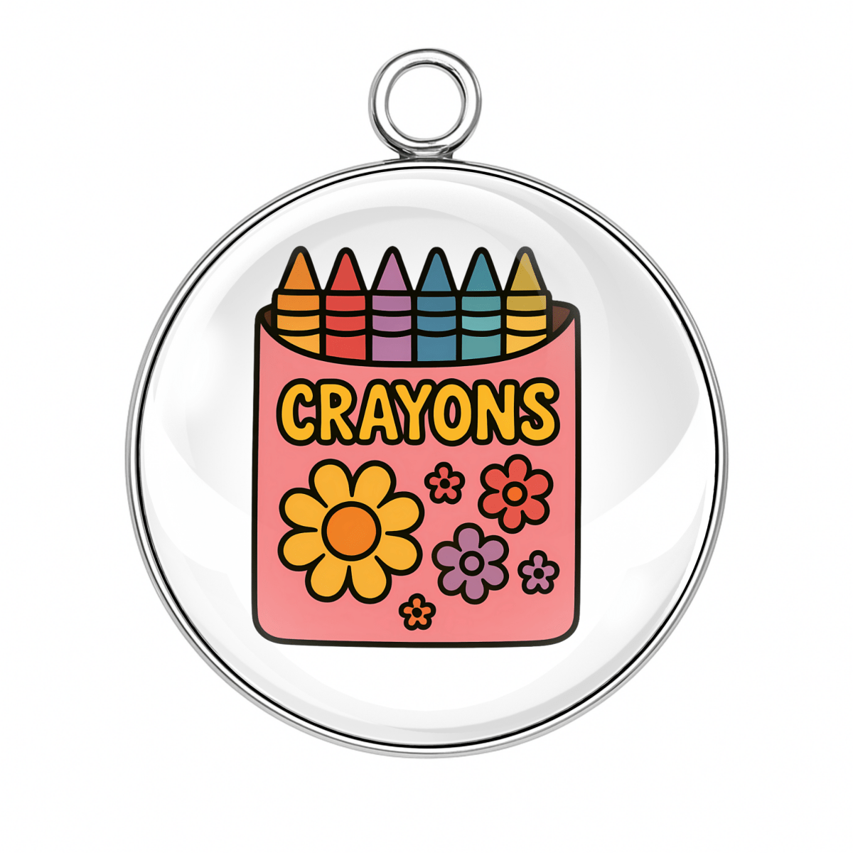 Our handmade Back to School Charms bring vintage vibes and teacher-approved flair to all your crafting projects. Each charm features bright, cheerful artwork sealed under a crystal-clear glass cabochon and nestled in a stainless steel base (available in silver or gold tone).