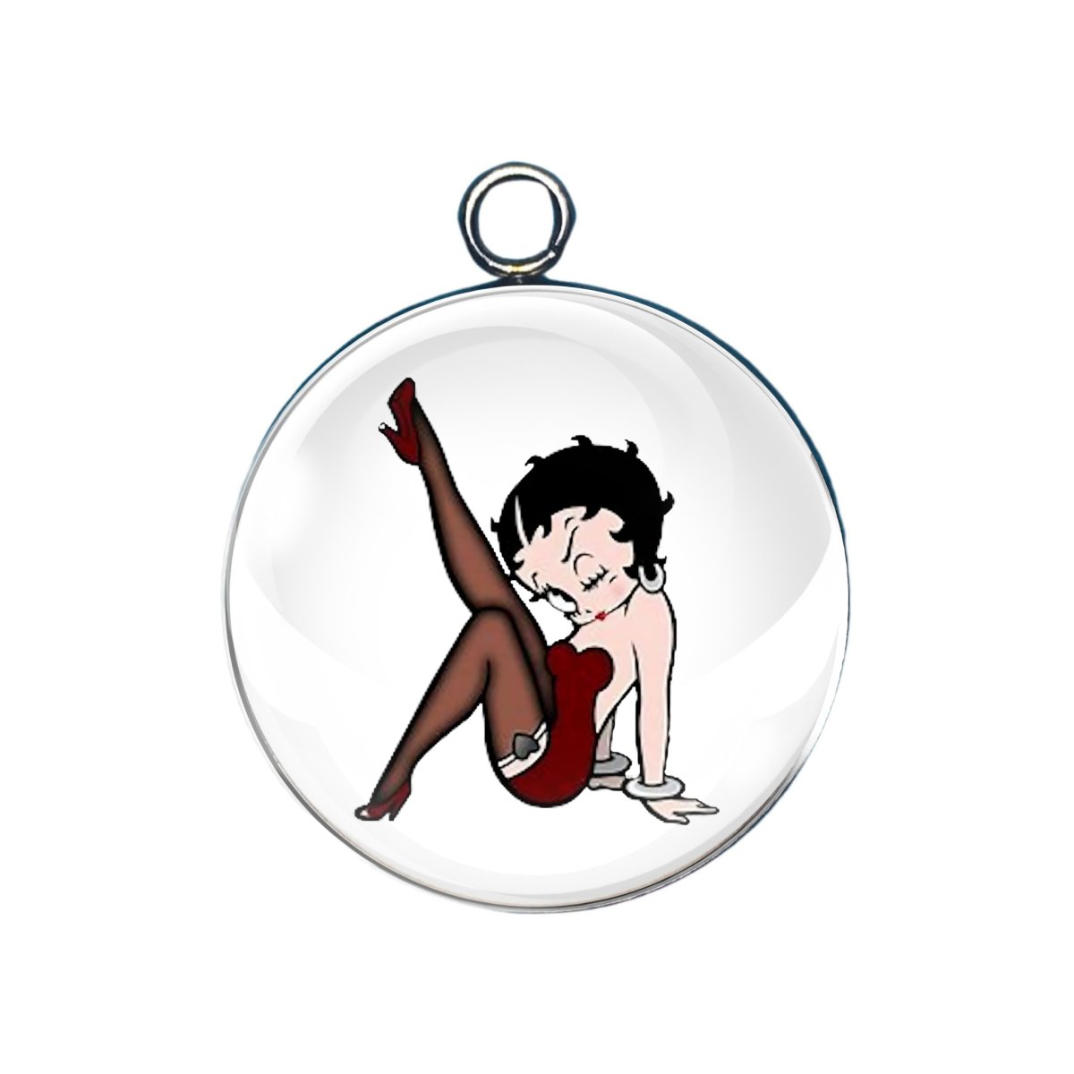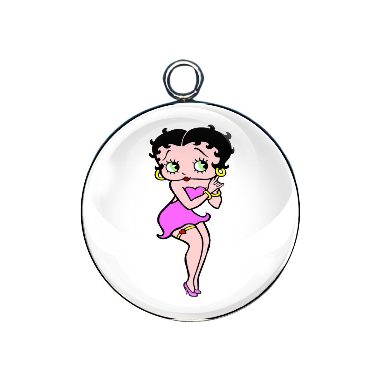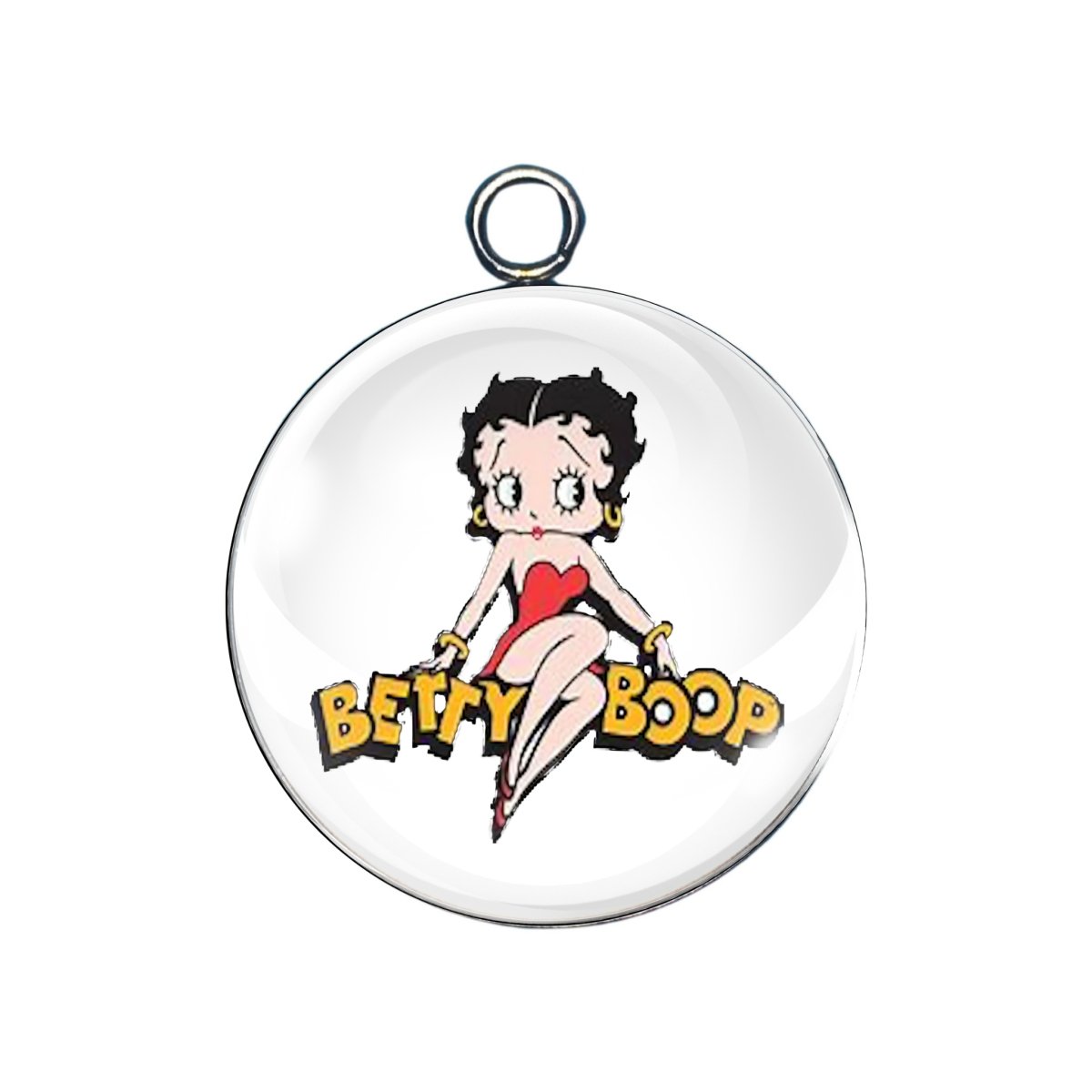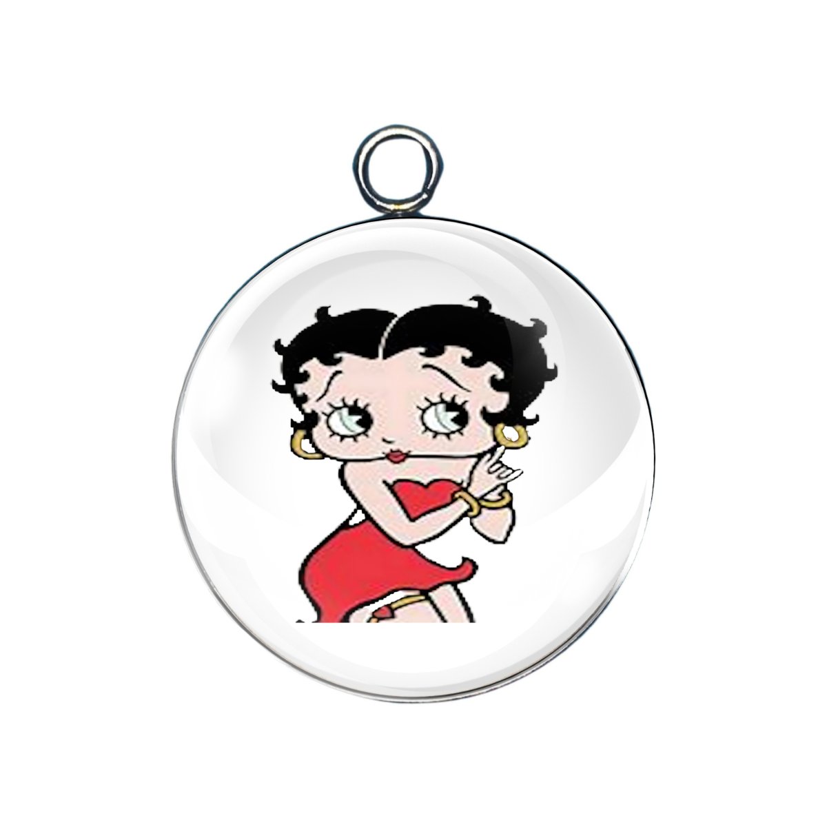 We make our Betty Boop charms with glass cabochons and they are set in a stainless steel base. We make these Charms/pendants in three different sizes.