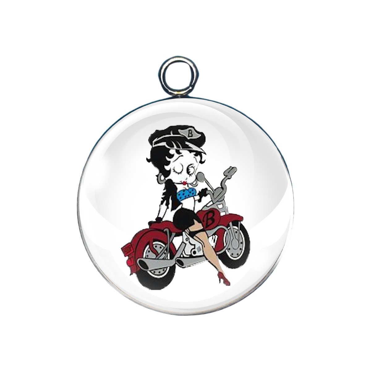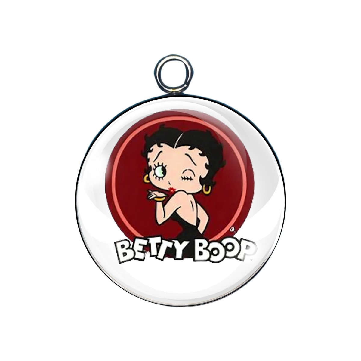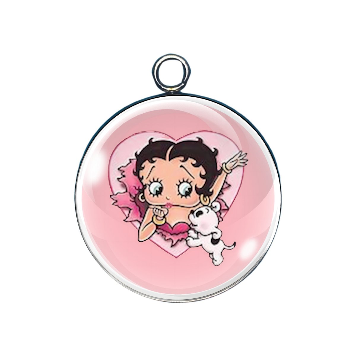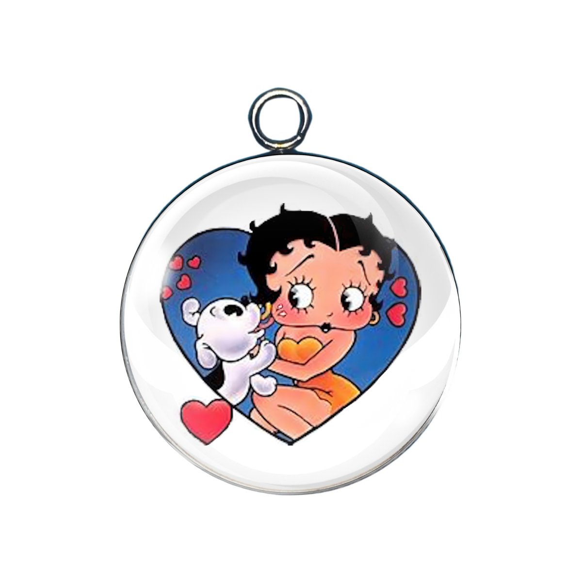 We make our Betty Boop charms with glass cabochons and they are set in a stainless steel base. We make these Charms/pendants in three different sizes.
