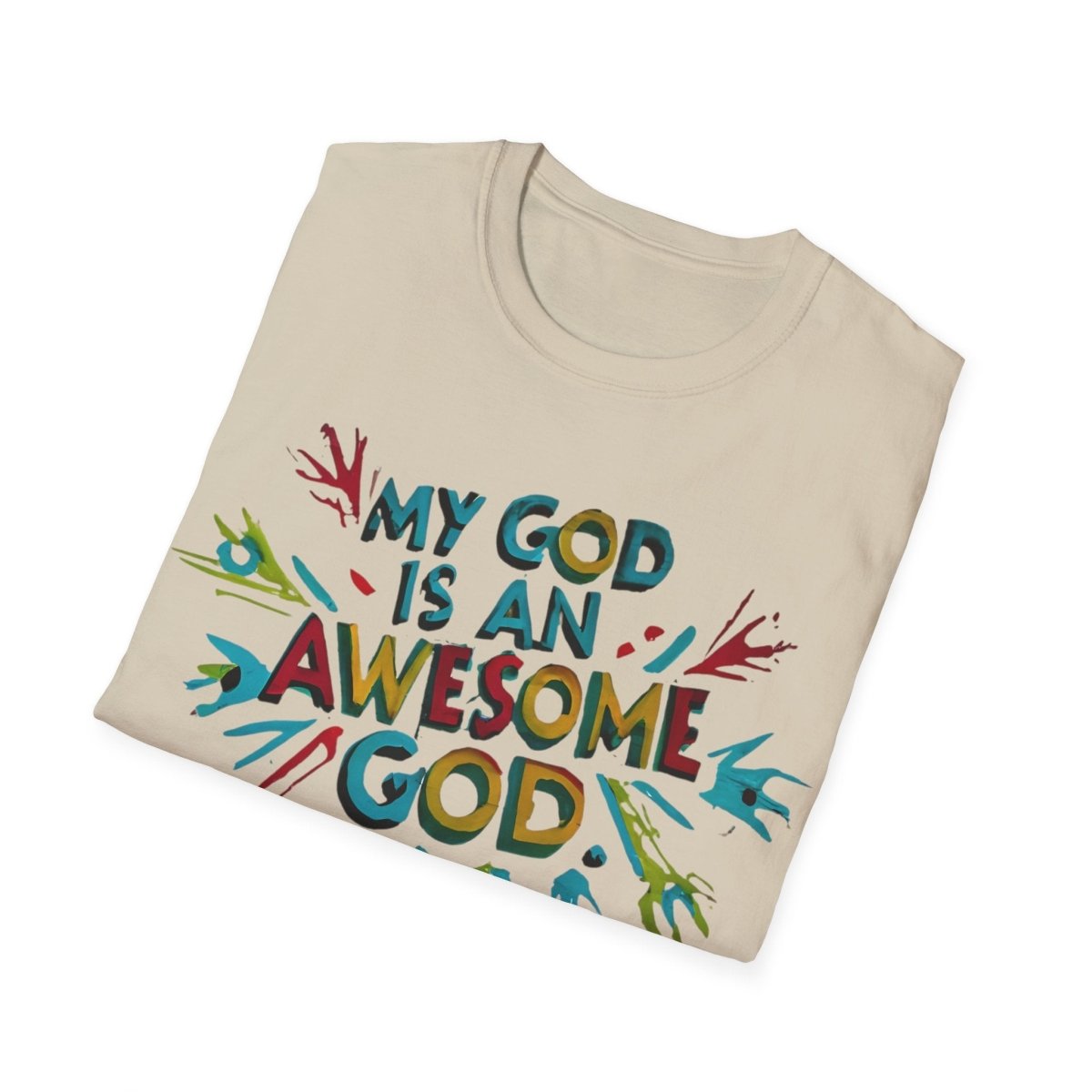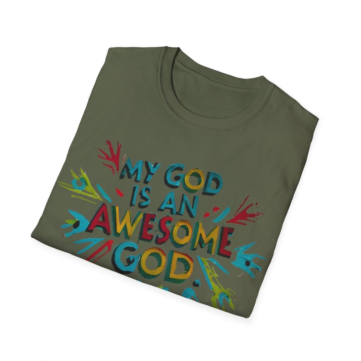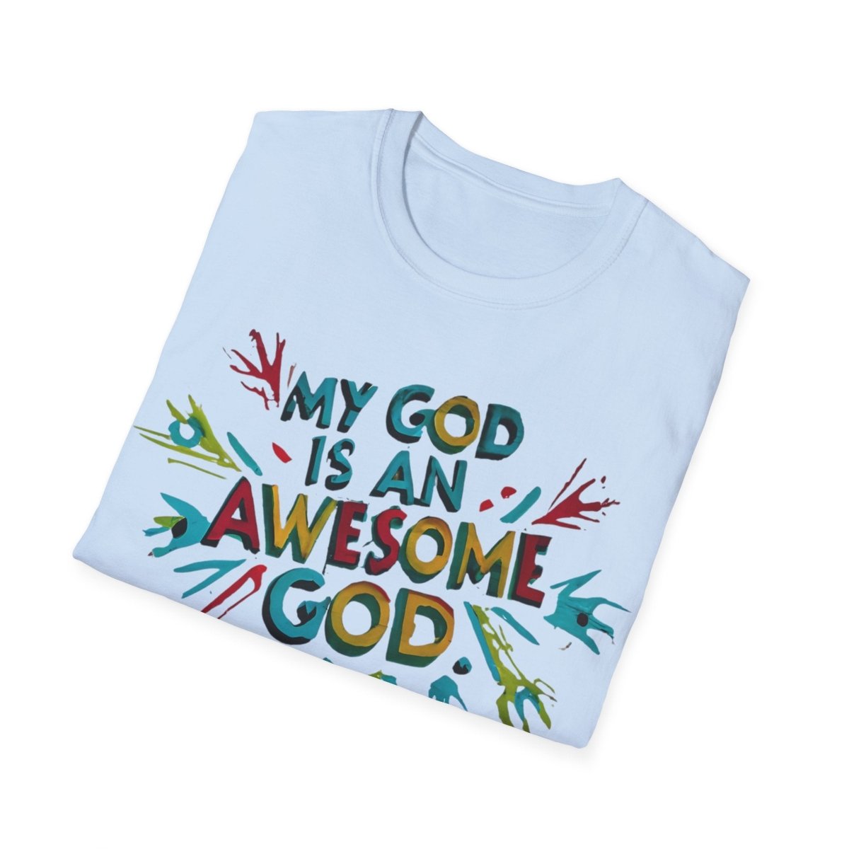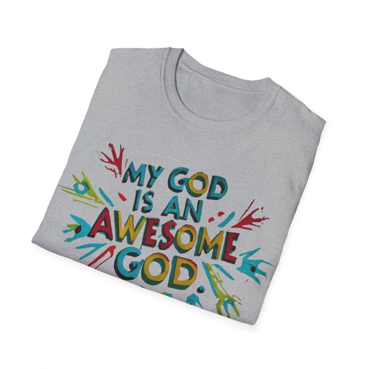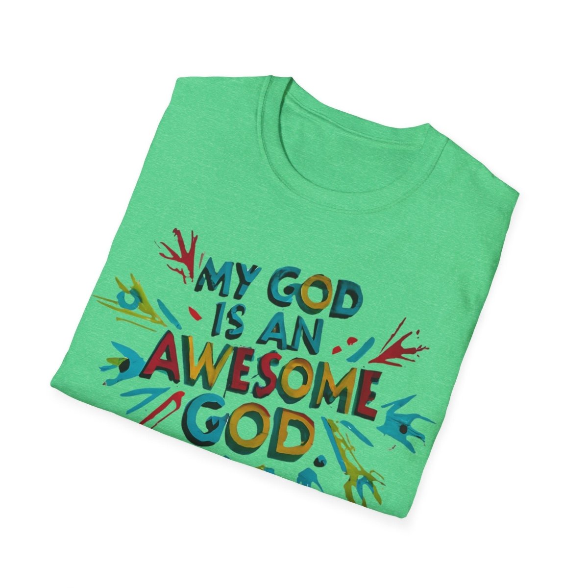 This Unisex Softstyle T-Shirt features a 'My God is an Awesome God' design, perfect for those who want to showcase their faith in a stylish way. Made from durable and smooth fabric, this t-shirt is comfortable to wear all year round. The classic fit and crew neckline make it versatile for any occasion, whether formal or casual. Ideal for adults looking for a religious-themed shirt.
