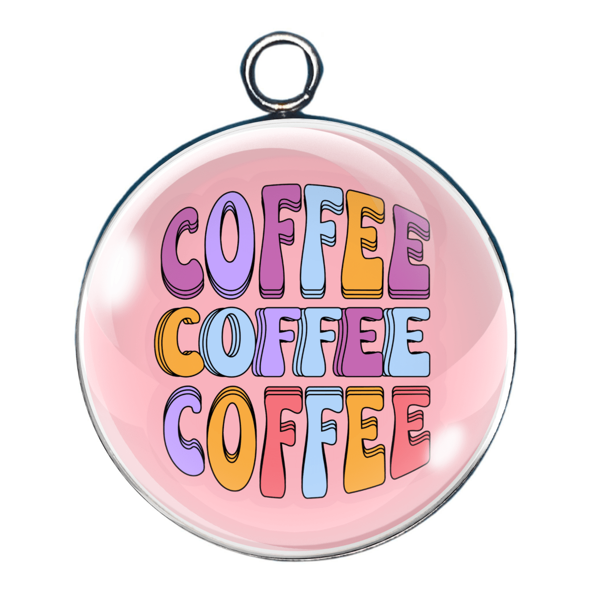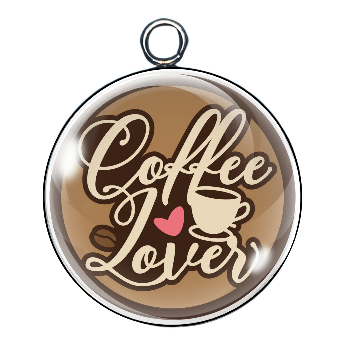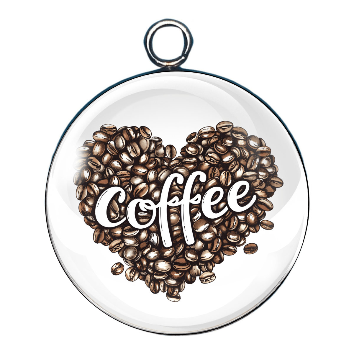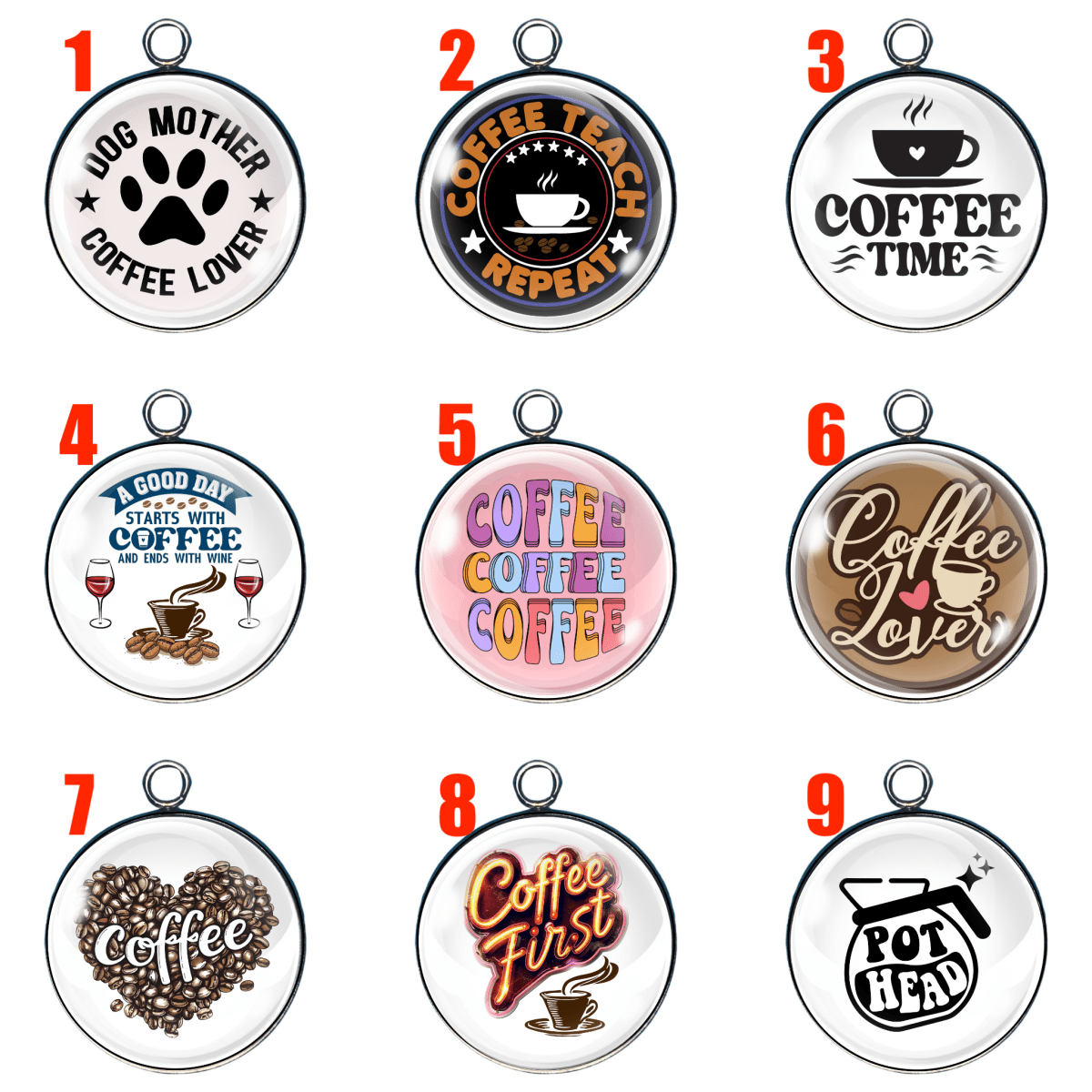 We make our Coffee Lover charms with glass cabochons and they are set in a stainless steel base. We make these Charms/pendants in three different sizes.