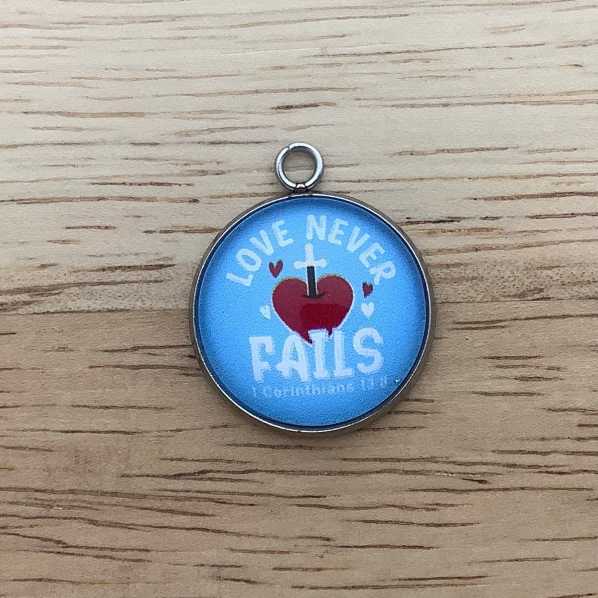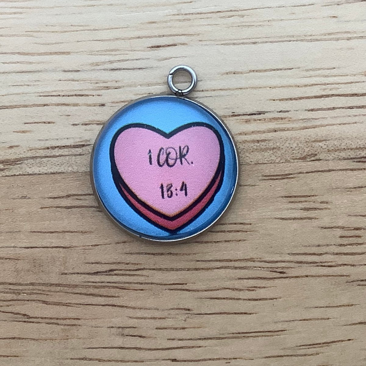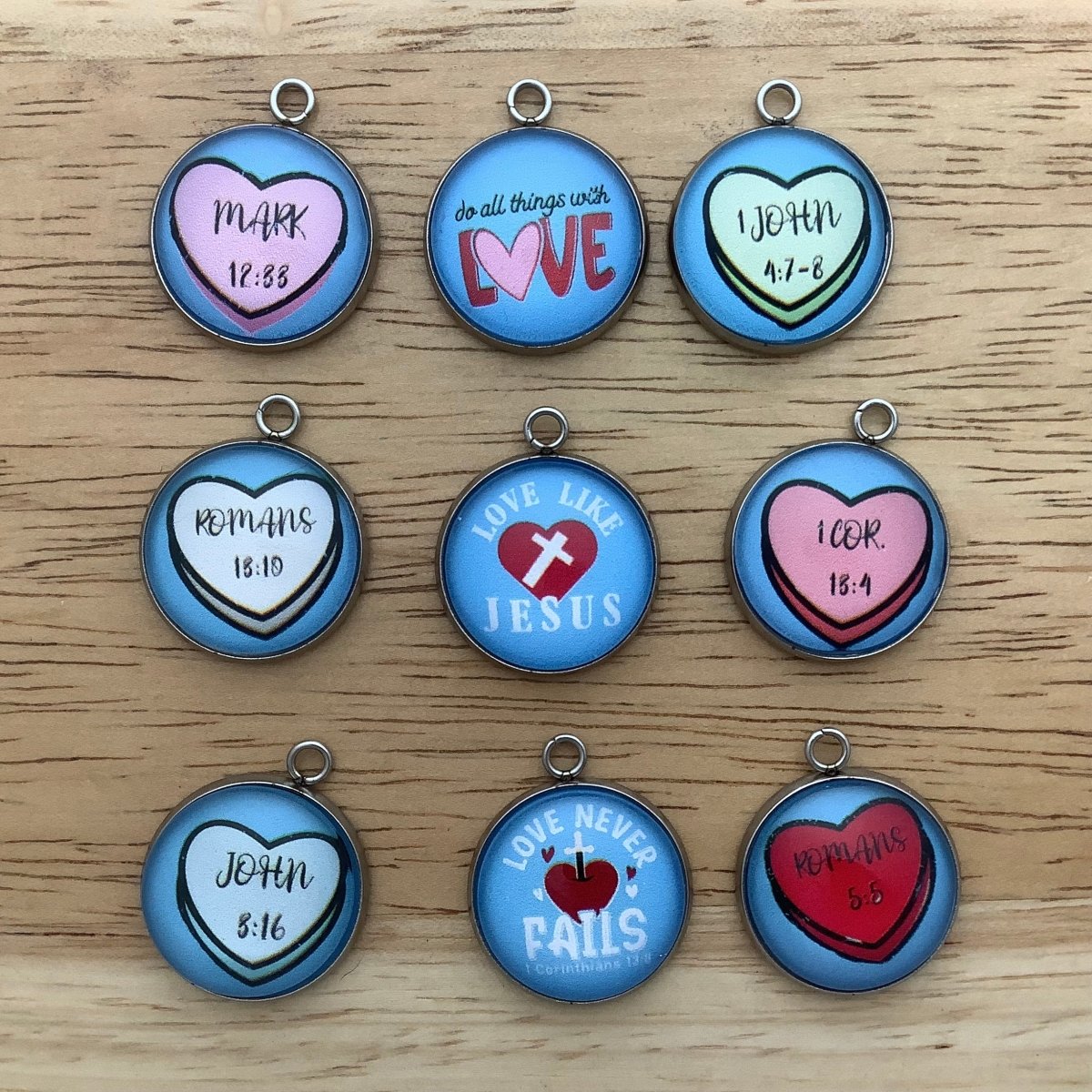Spread love like Jesus with these adorable charms featuring scripture verses on candy hearts. Show the world that love never fails and inspire others to do all things with love through these Divine Scripture Delights. Celebrate your faith and Valentine's Day with these charming jewelry pieces.