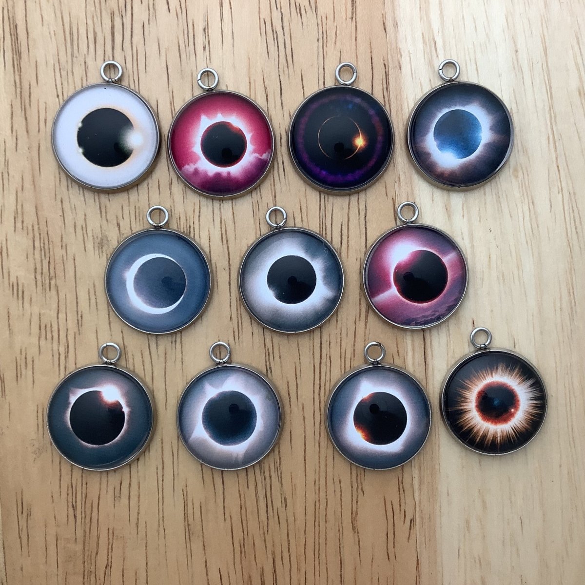 Unlock the enchantment of an eclipse with these alluring glass cabochon charms! Featuring a diverse range of stunning eclipse images, these unique pieces are a must-have for any jewelry making project. Add a touch of cosmic beauty and intrigue to your designs and let your creativity soar!
