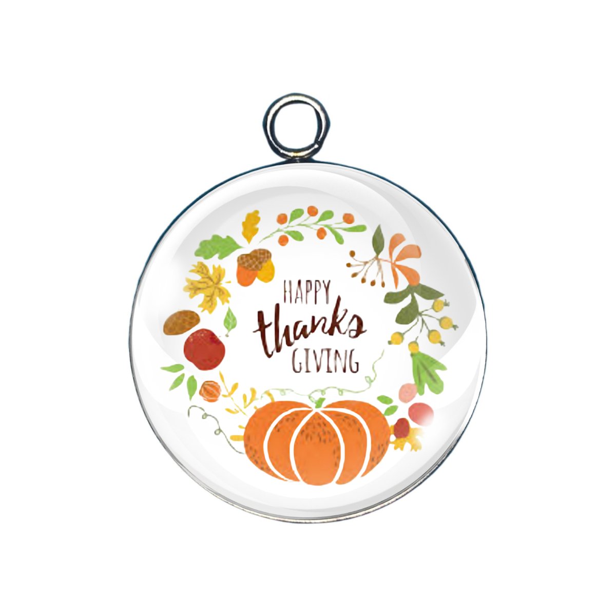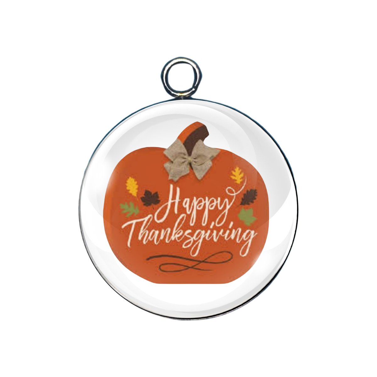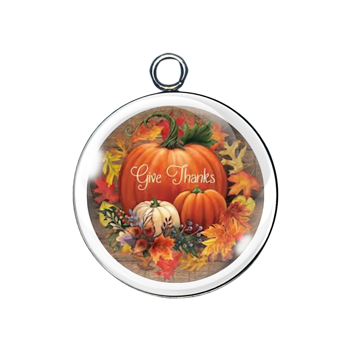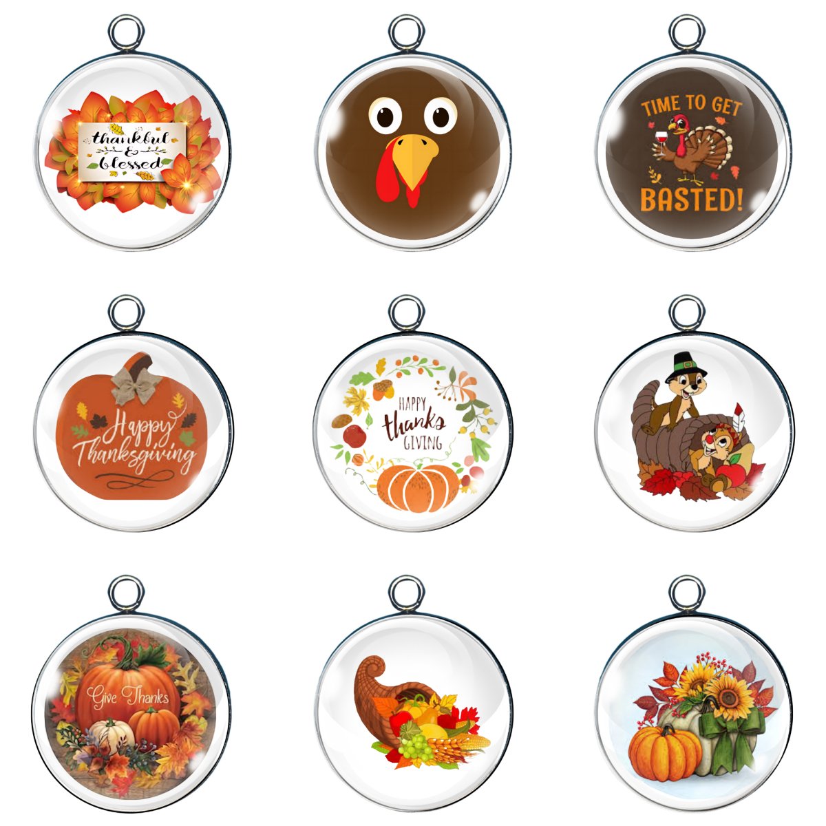We make our Fall / Thanksgiving charms with glass cabochons and they are set in a stainless steel base. We make these Charms/pendants in three different sizes.