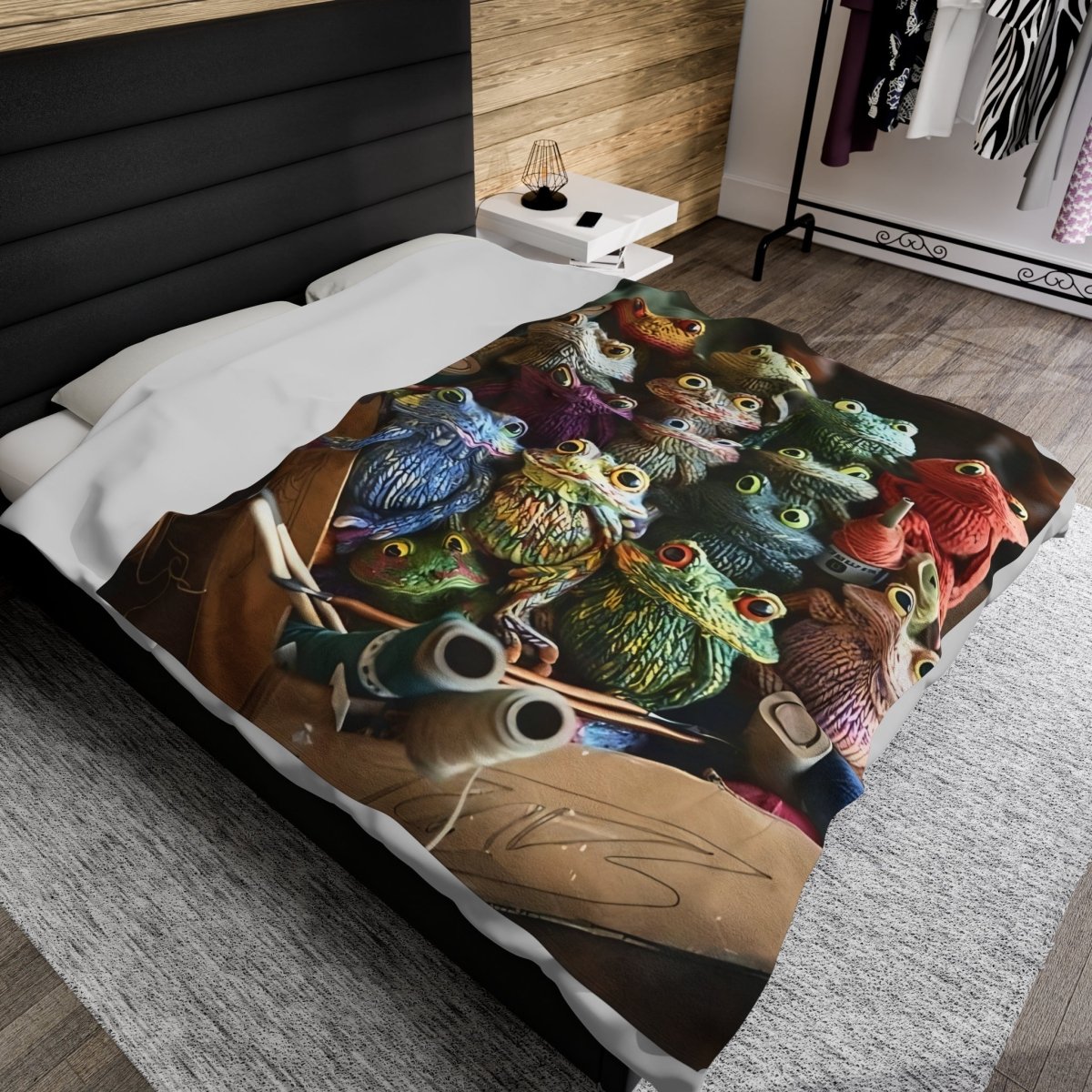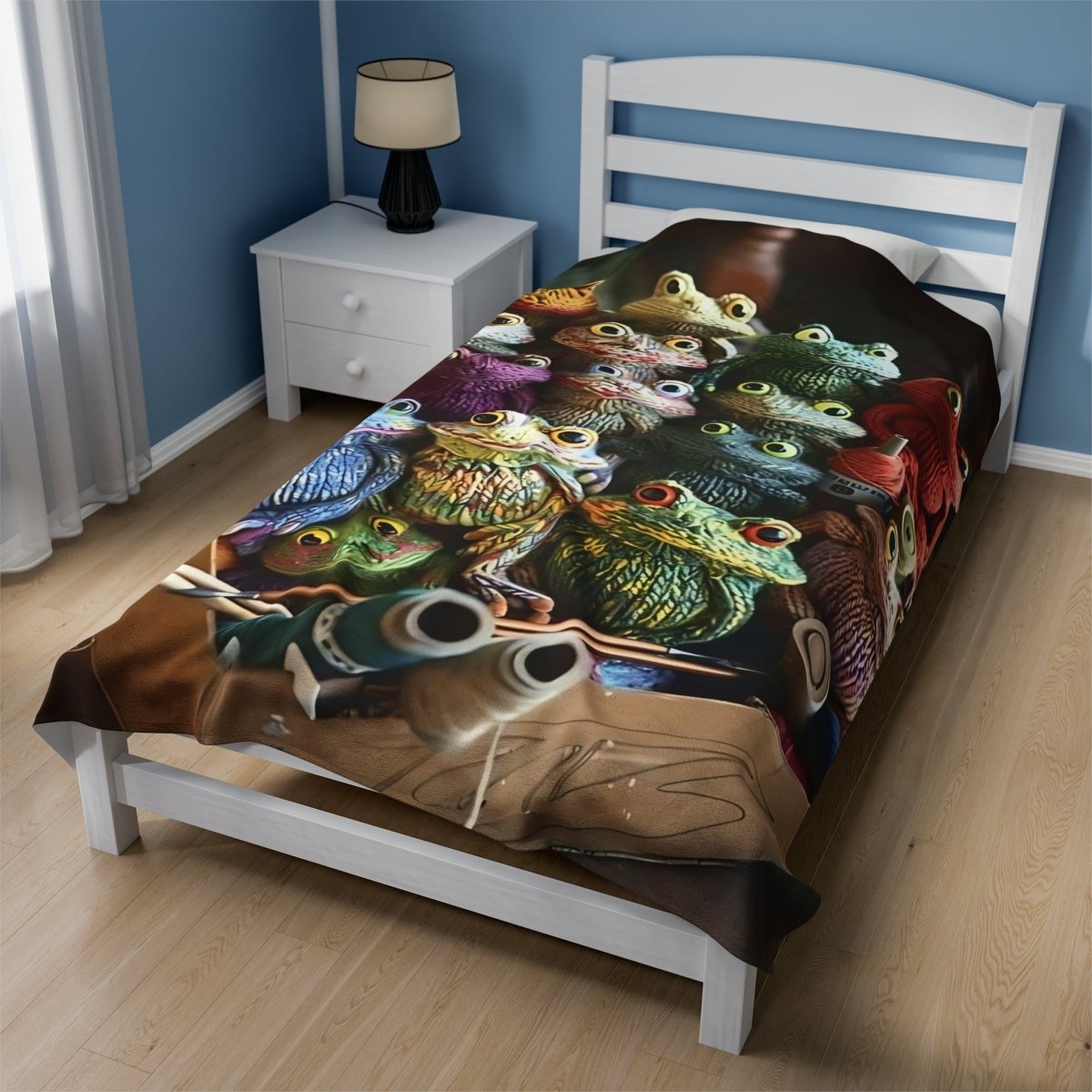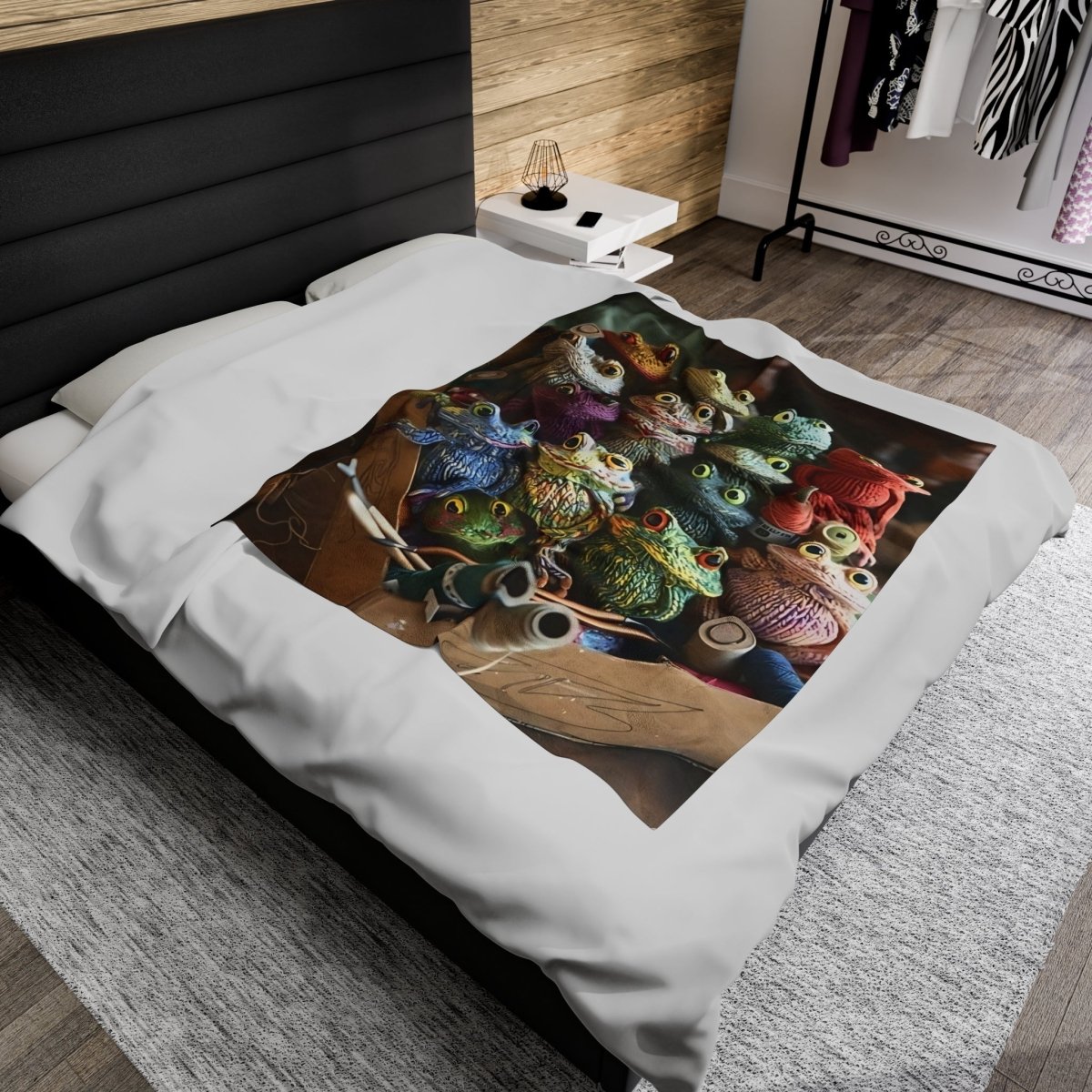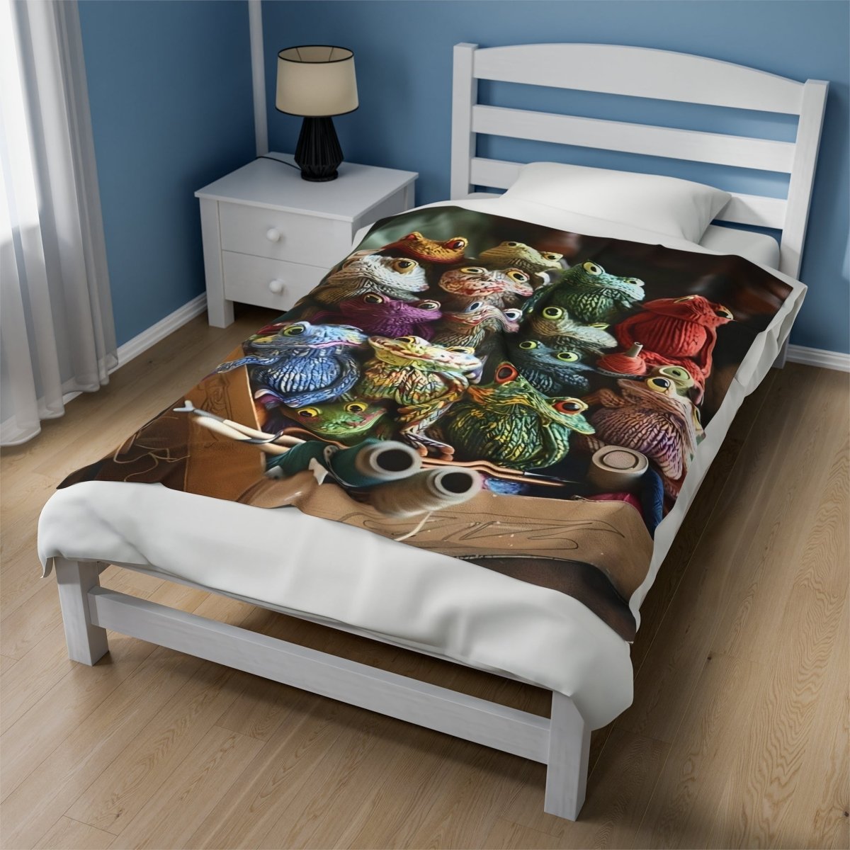 This velveteen plush blanket featuring crochet frogs is perfect for cozying up on chilly nights or adding a whimsical touch to your home decor. It's ideal for frog enthusiasts, nature lovers, or anyone looking to add a playful touch to their living space. Great for gifting on birthdays, Easter, or just because!