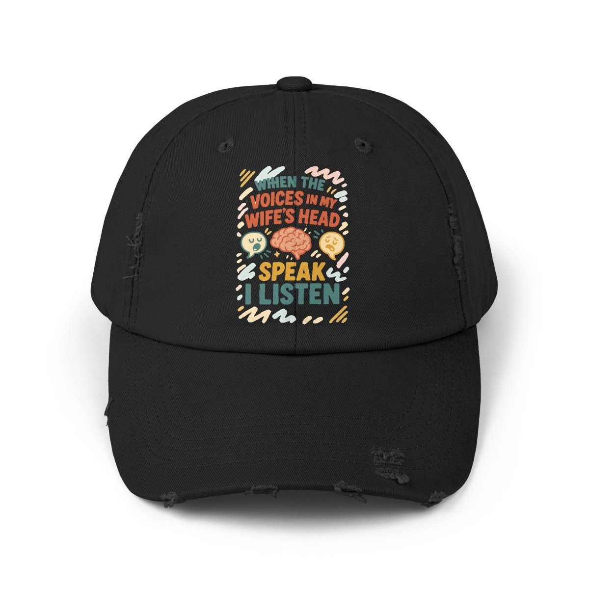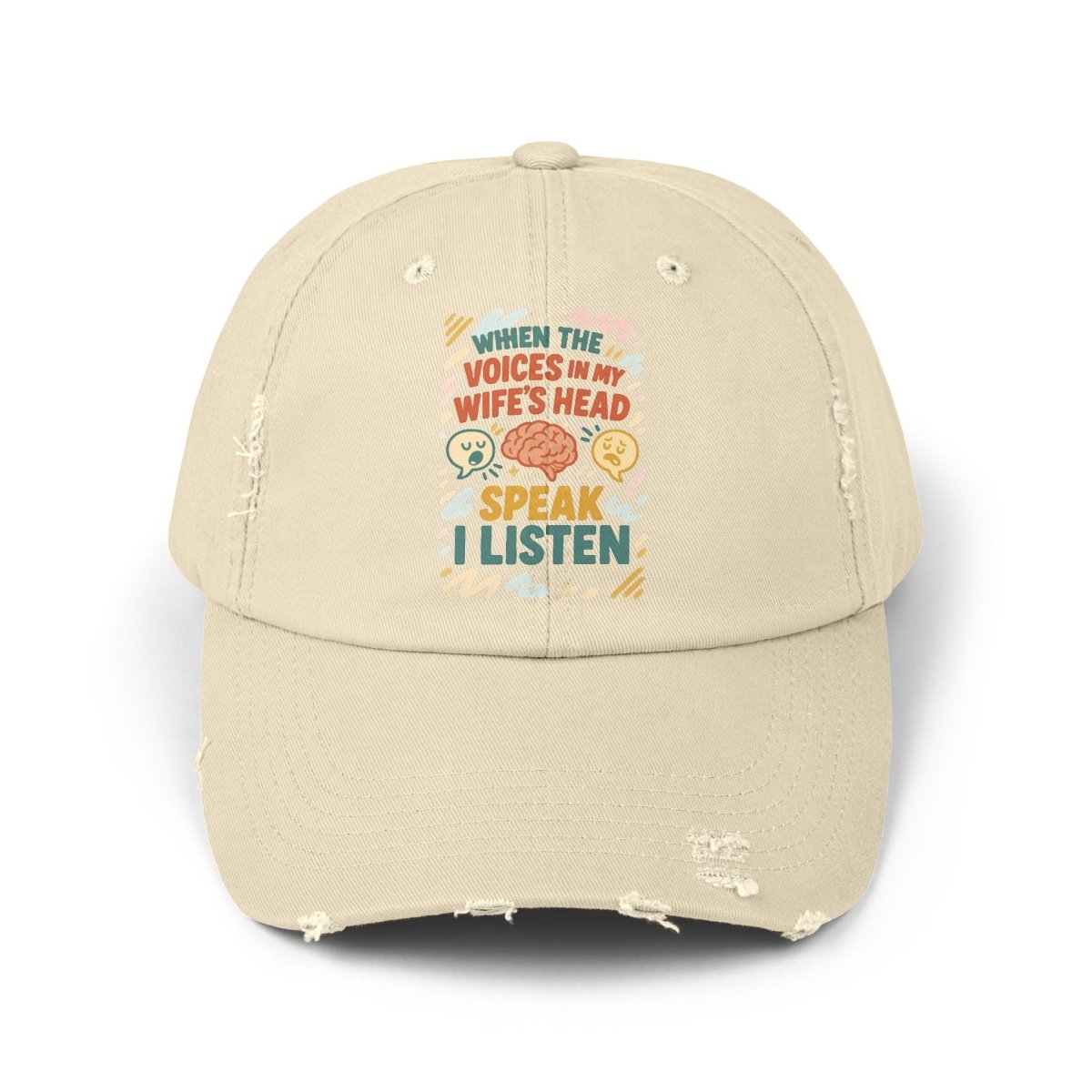 Add a dash of humor to your everyday look with our vintage-style distressed cap featuring the hilarious quote: "When the voices in my wife’s head speak, I listen." Crafted from 100% cotton twill, this unisex cap offers a comfy, relaxed fit with a low-profile silhouette and an unstructured design for that effortless “worn-in” vibe.