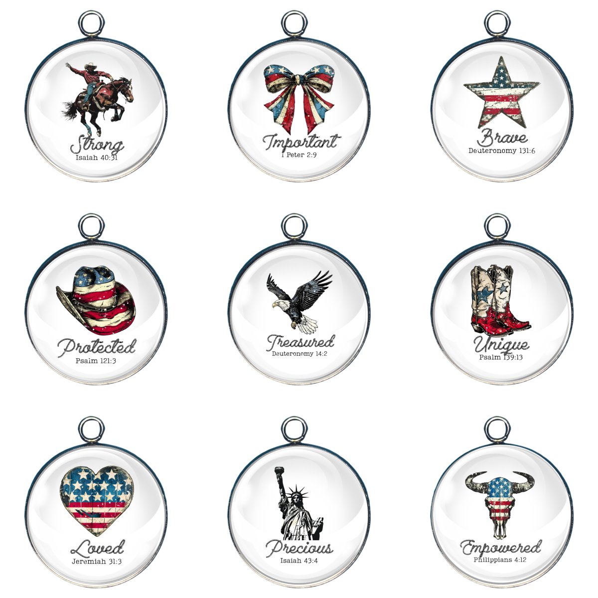Celebrate each day with your love of God and Country with these Glass Cabochon Charms featuring patriotic images with attributes that describe who you are in Christ with coordinating Bible verses.