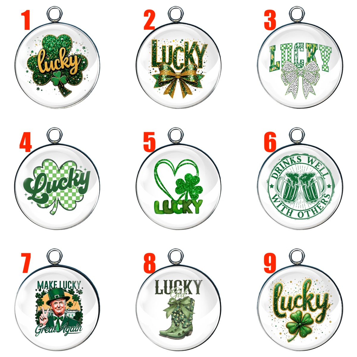 Add some luck to your style with our handmade Lucky Charms for Bracelets/Necklaces. Made with crystal clear glass cabochons and a never-fade stainless steel base, these charms are perfect for St. Patrick's Day. Available in silver or gold. Handcrafted in the USA for quality you can trust.
