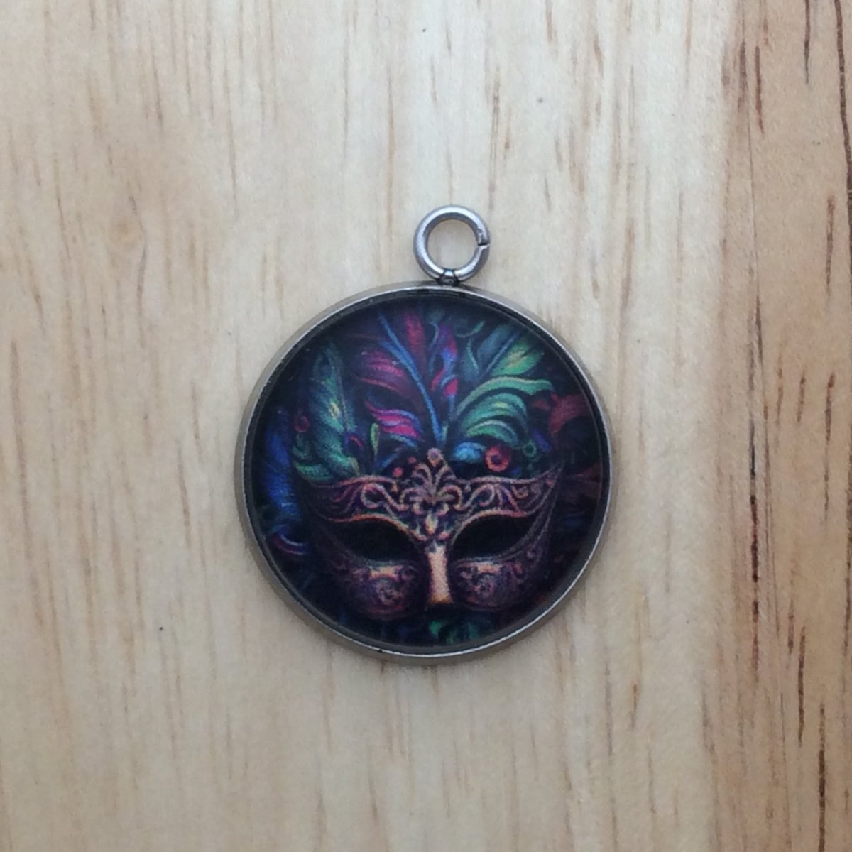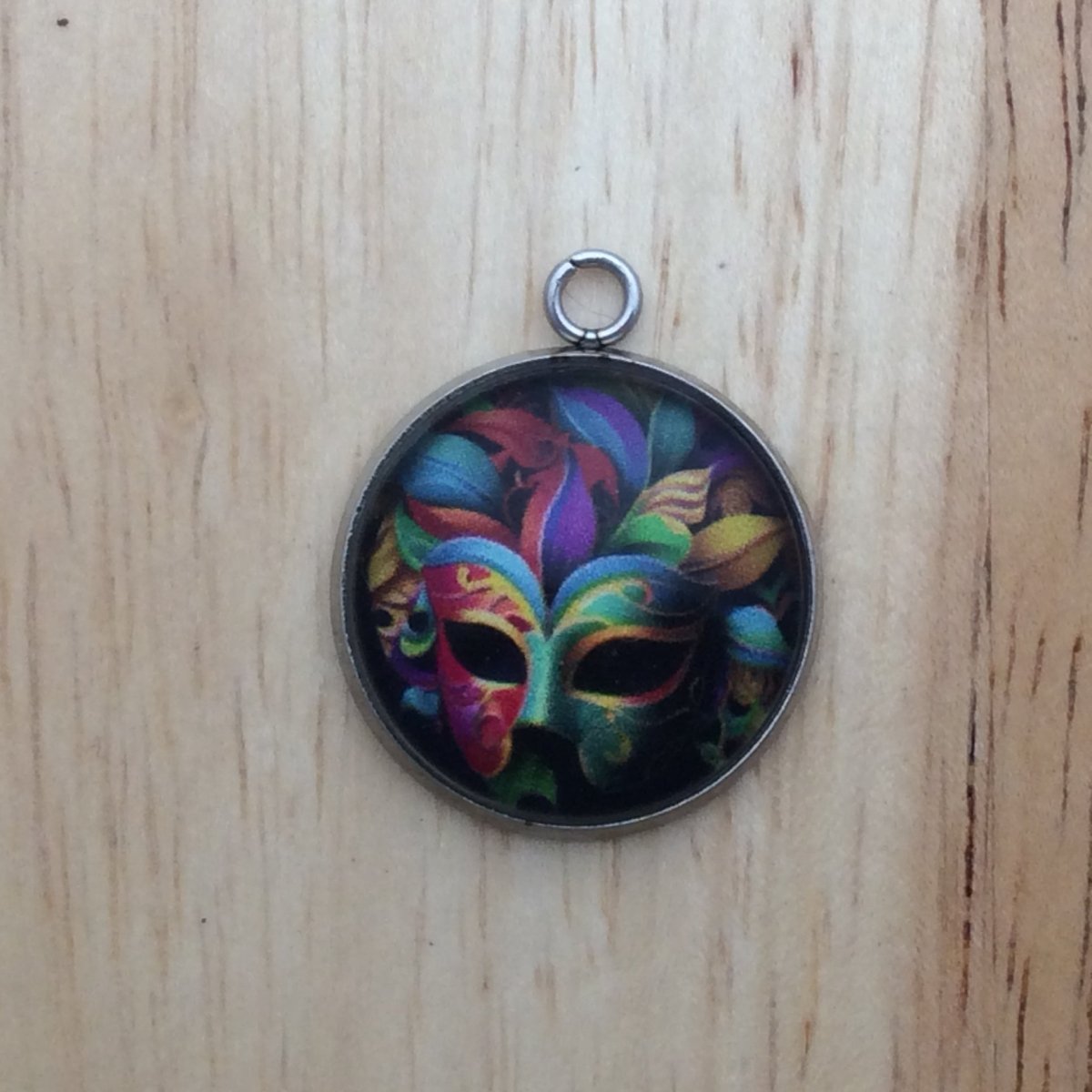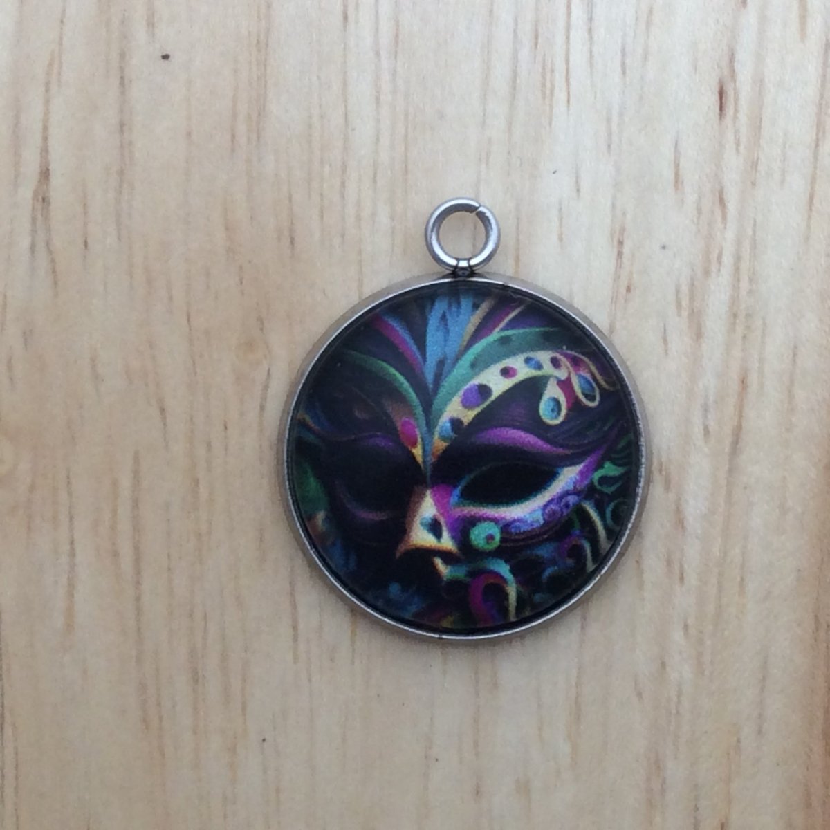 At I Like Worms, We make our Mardi Gras Mask charms with glass cabochons and they are set in a stainless steel base. We make these Charms and pendants in three different sizes.