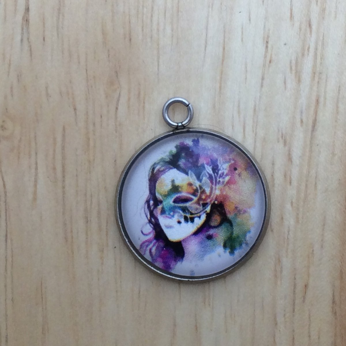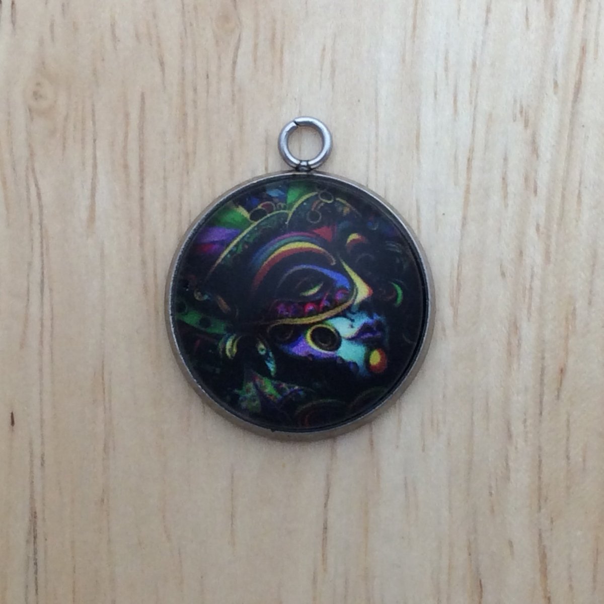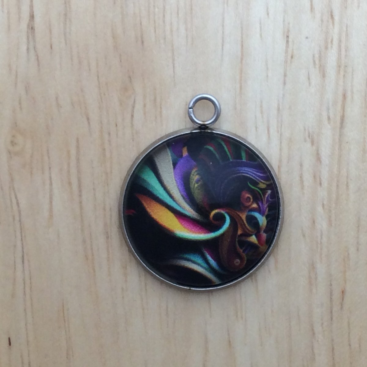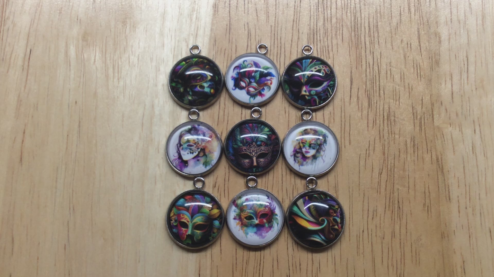 At I Like Worms, We make our Mardi Gras Mask charms with glass cabochons and they are set in a stainless steel base. We make these Charms and pendants in three different sizes.