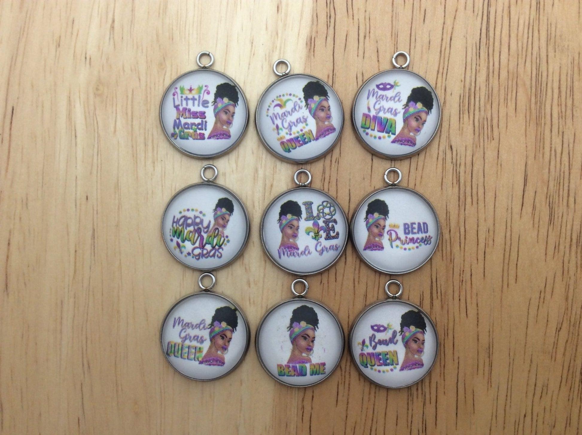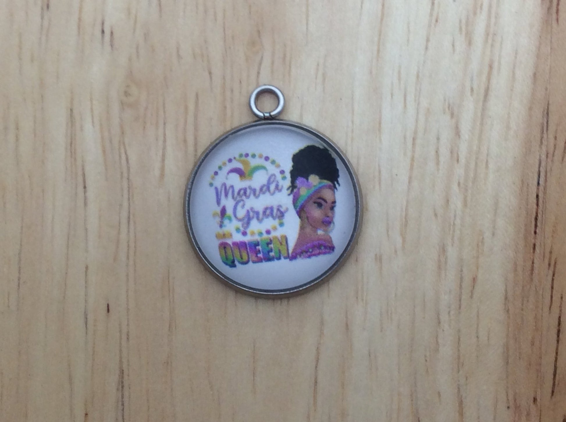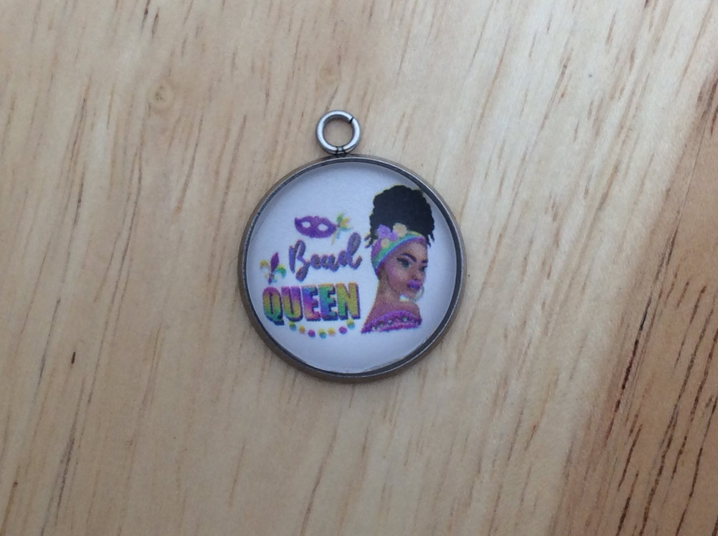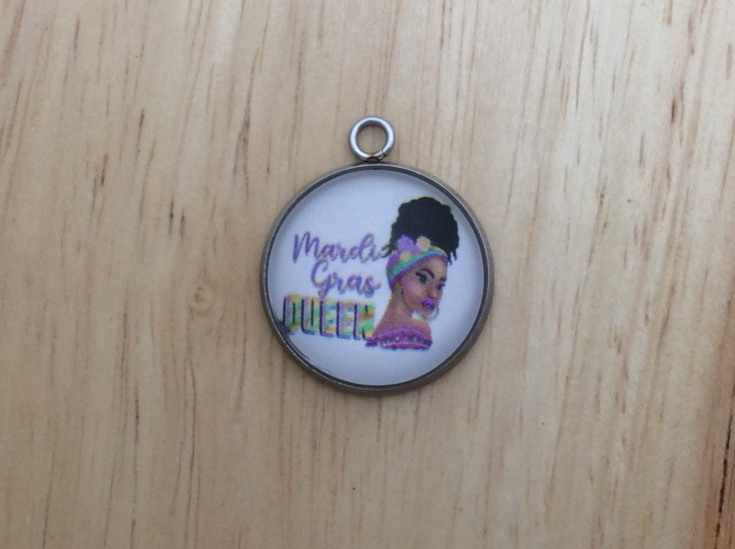 At I Like Worms, We make our Mardi Gras Queen charms with glass cabochons and they are set in a stainless steel base. We make these Charms and pendants in three different sizes.