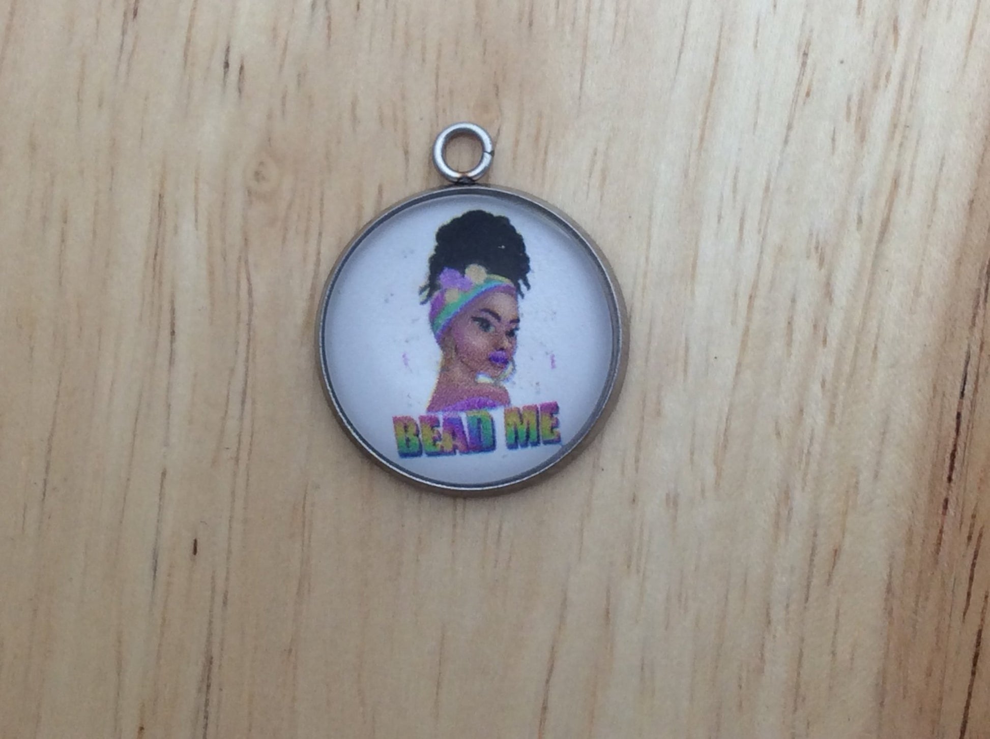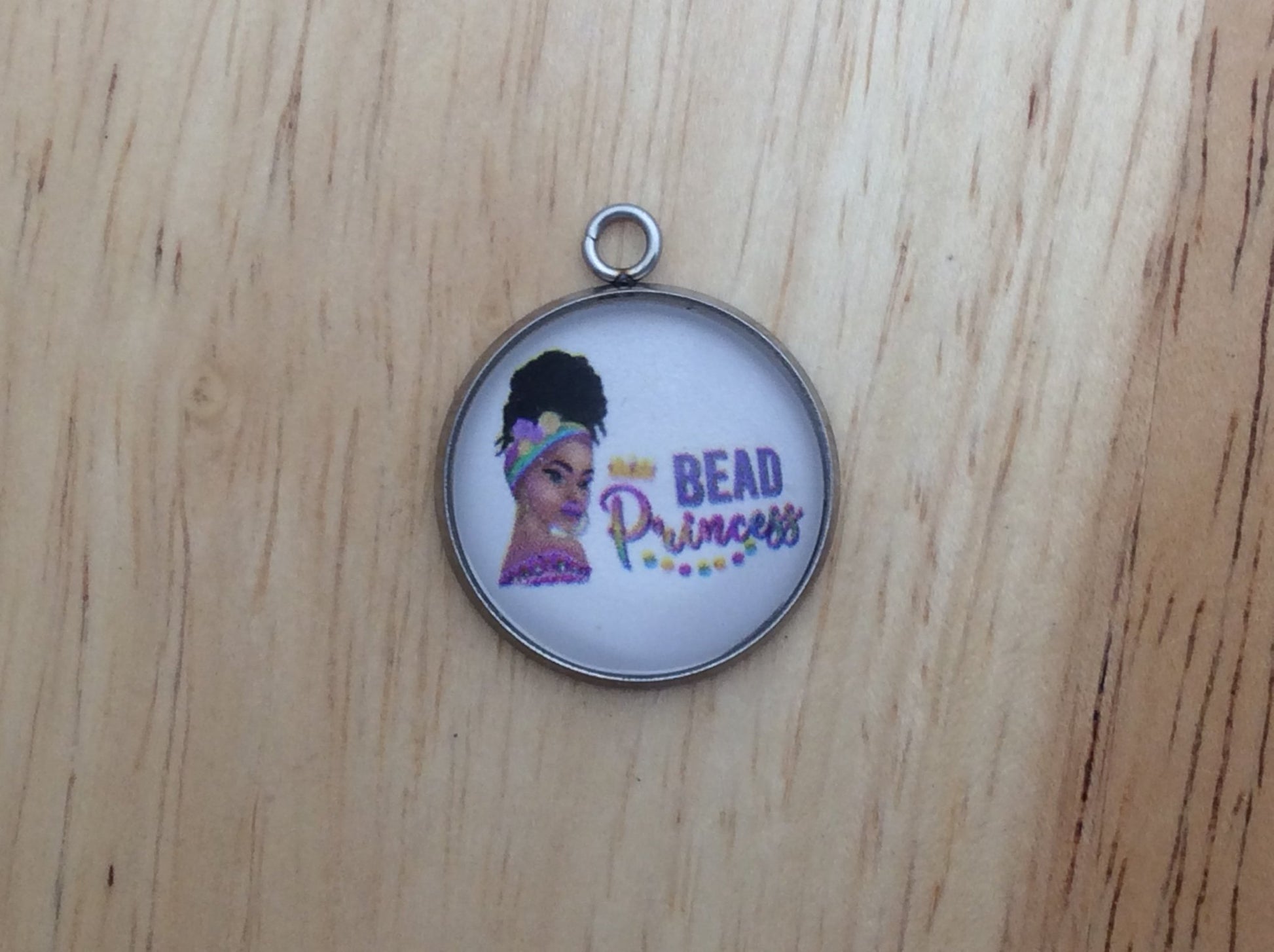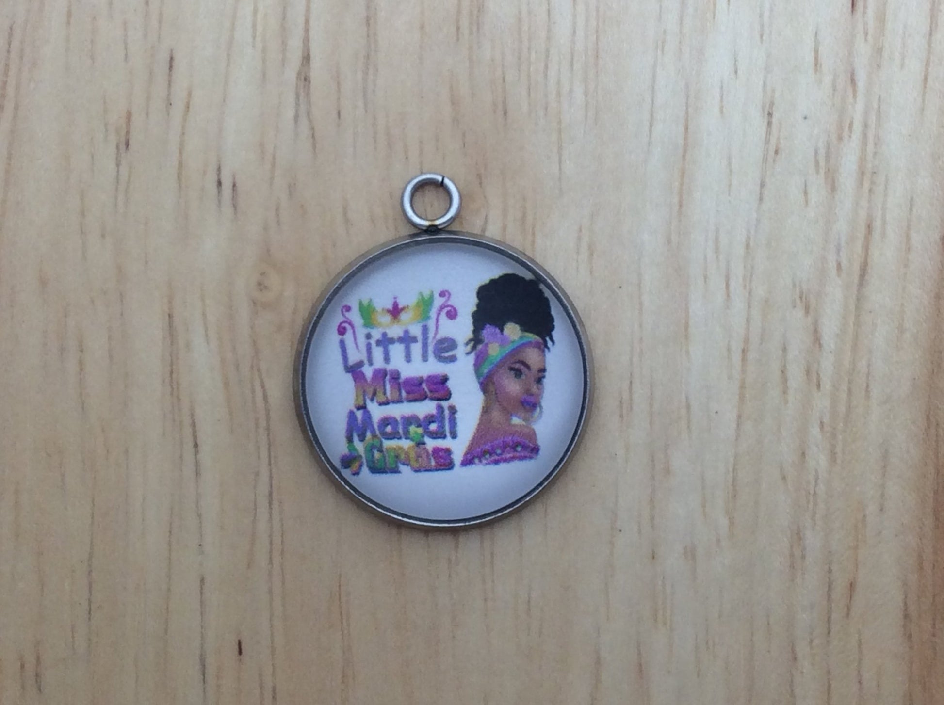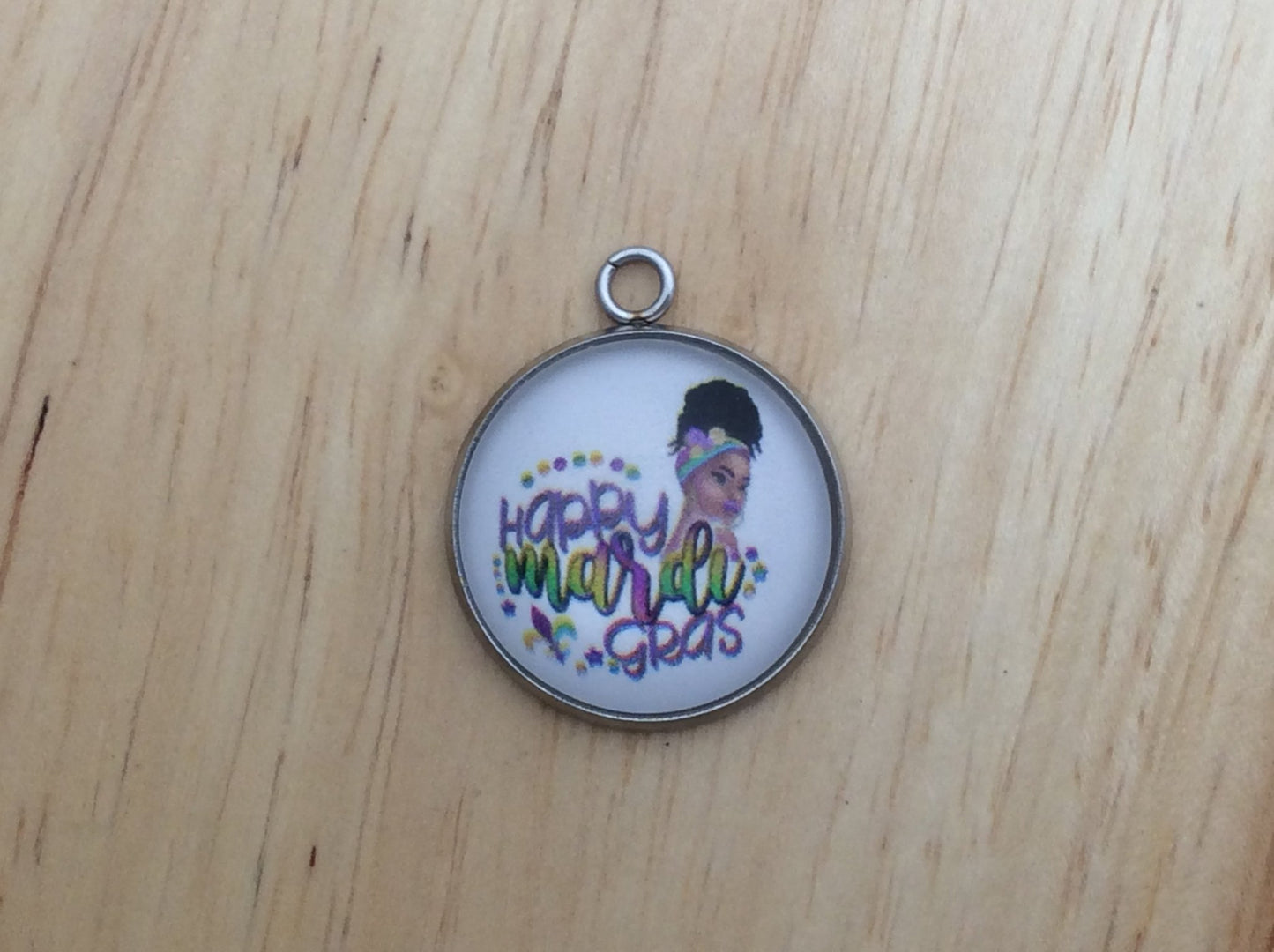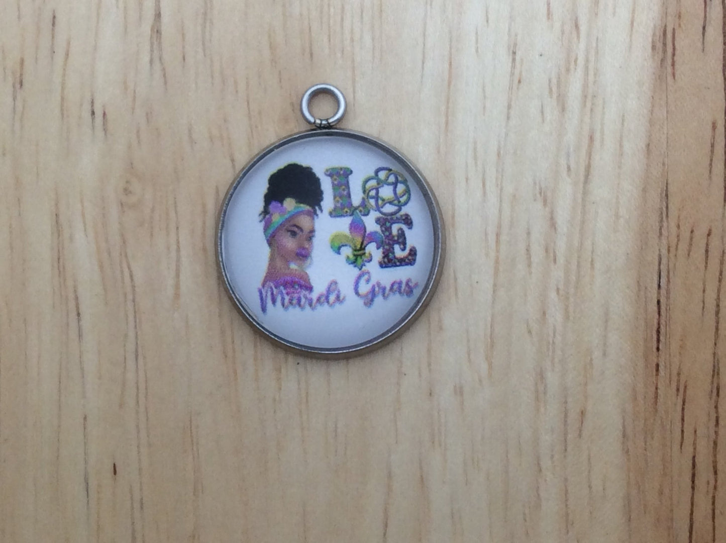 At I Like Worms, We make our Mardi Gras Queen charms with glass cabochons and they are set in a stainless steel base. We make these Charms and pendants in three different sizes.