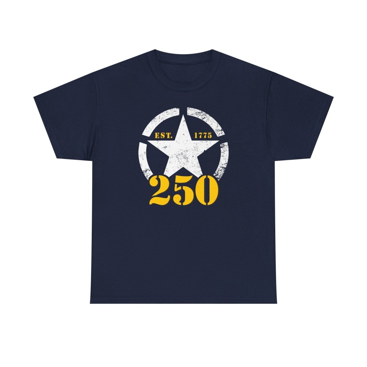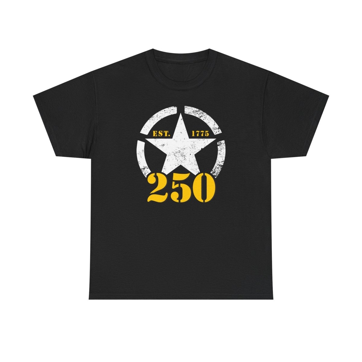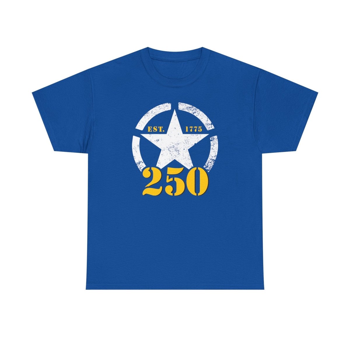 A classic unisex T-Shirt celebrating the military 250 years celebration. This shirt is made from high-quality fabric with various features like shoulder tape, ribbed knit collar, and no side seams. It is perfect for those who want a comfortable and durable shirt for everyday wear. Ideal for military members, history enthusiasts, and patriotic individuals. Suitable for Memorial Day, Independence Day, Veteran's Day, and military-themed events.