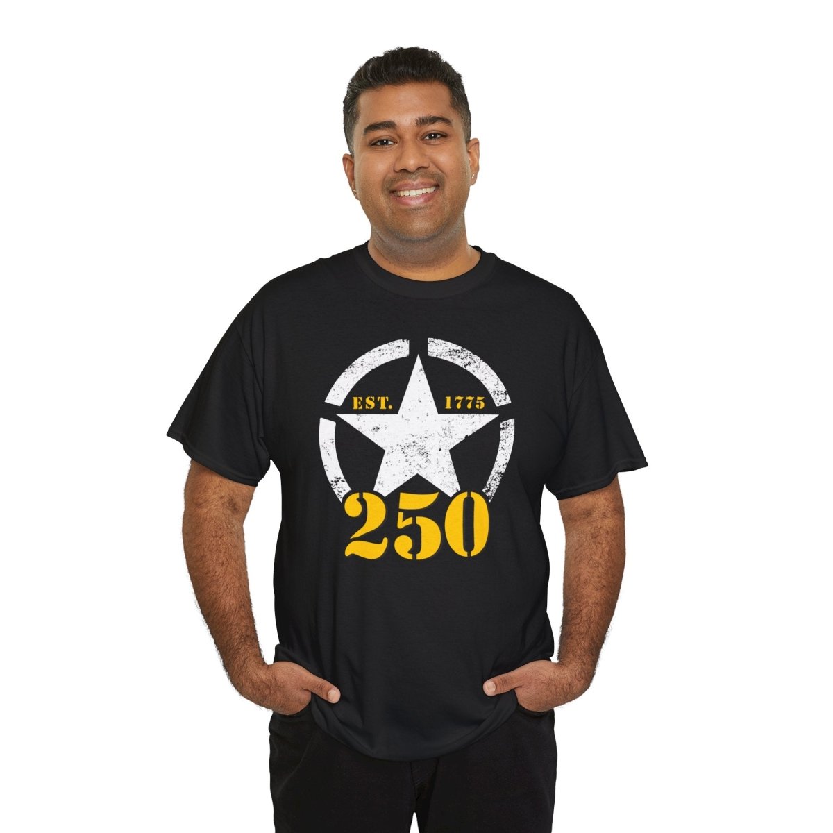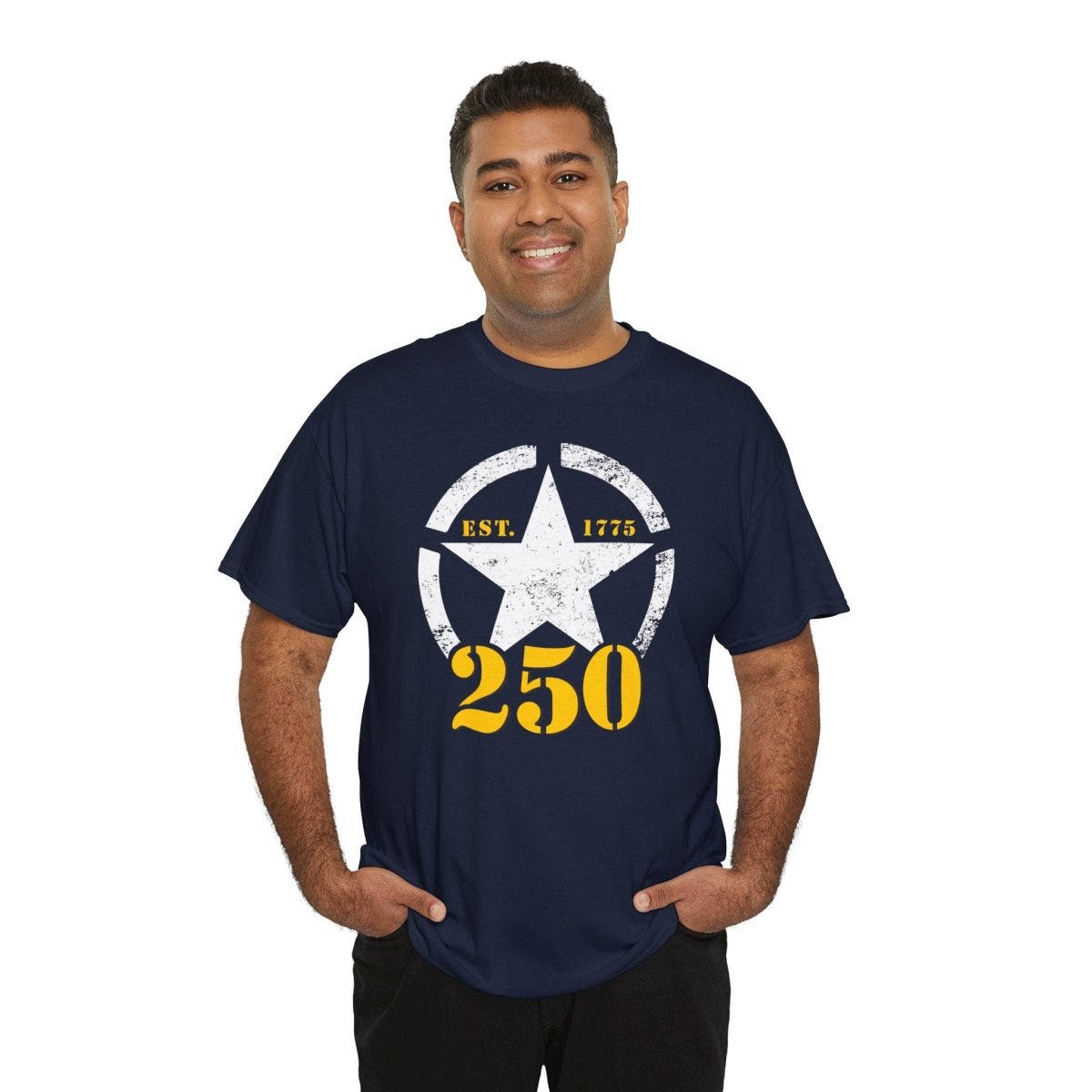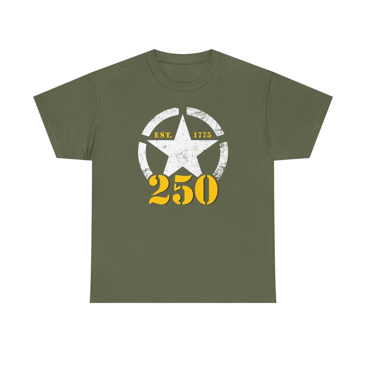 A classic unisex T-Shirt celebrating the military 250 years celebration. This shirt is made from high-quality fabric with various features like shoulder tape, ribbed knit collar, and no side seams. It is perfect for those who want a comfortable and durable shirt for everyday wear. Ideal for military members, history enthusiasts, and patriotic individuals. Suitable for Memorial Day, Independence Day, Veteran's Day, and military-themed events.