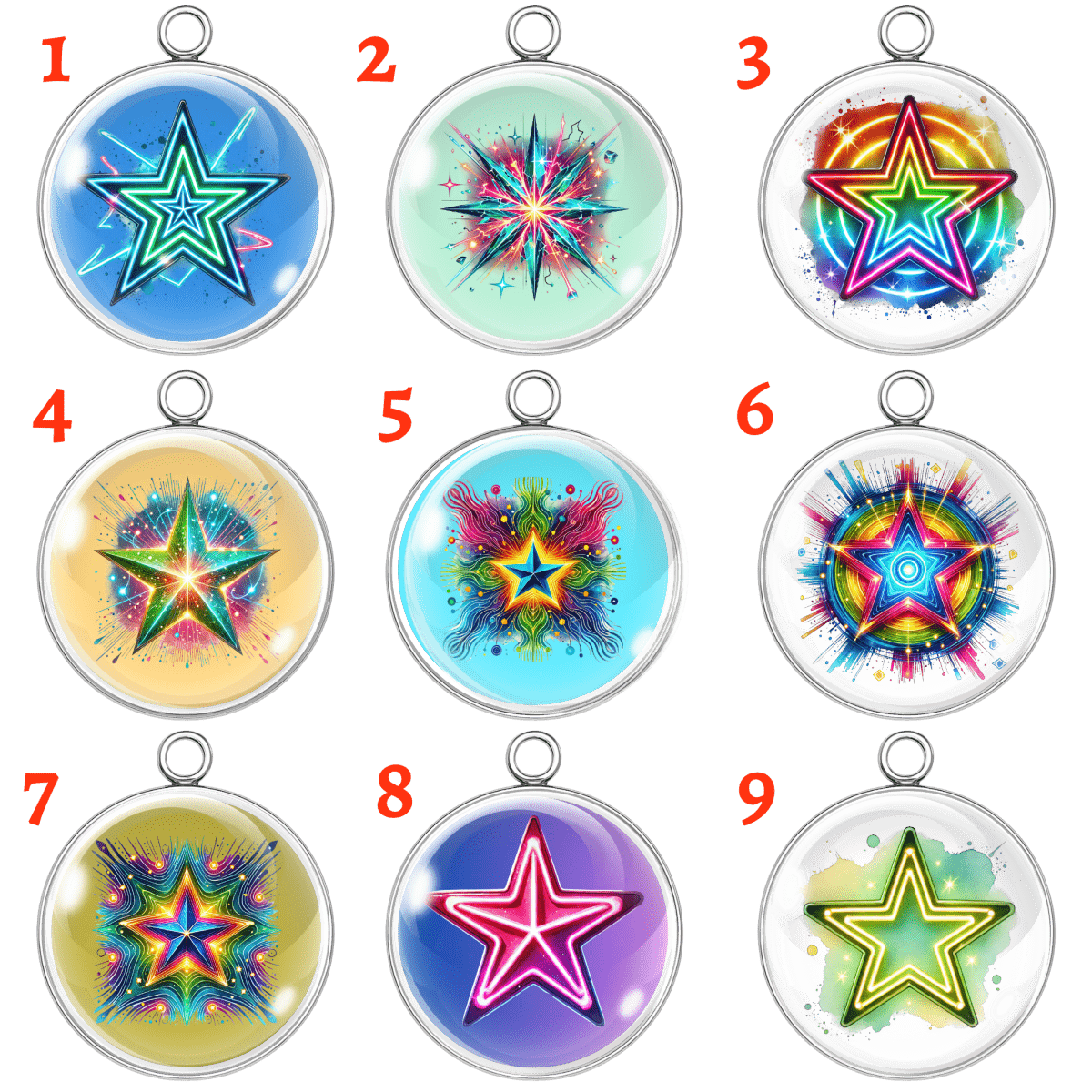 Neon Star Glass Cabochon Charms – 9 Bold Psychedelic Designs