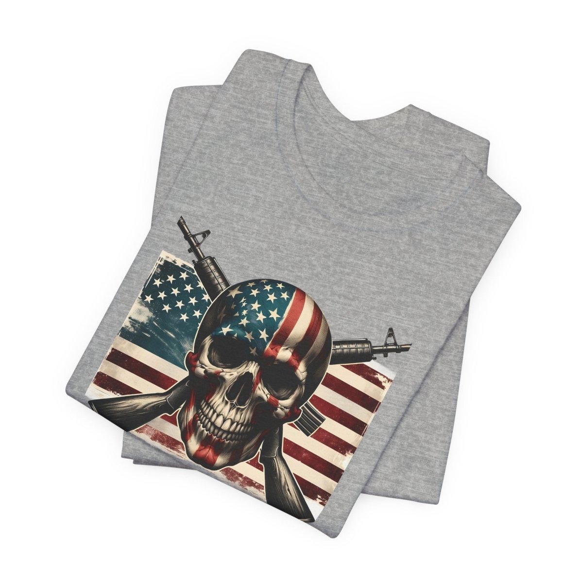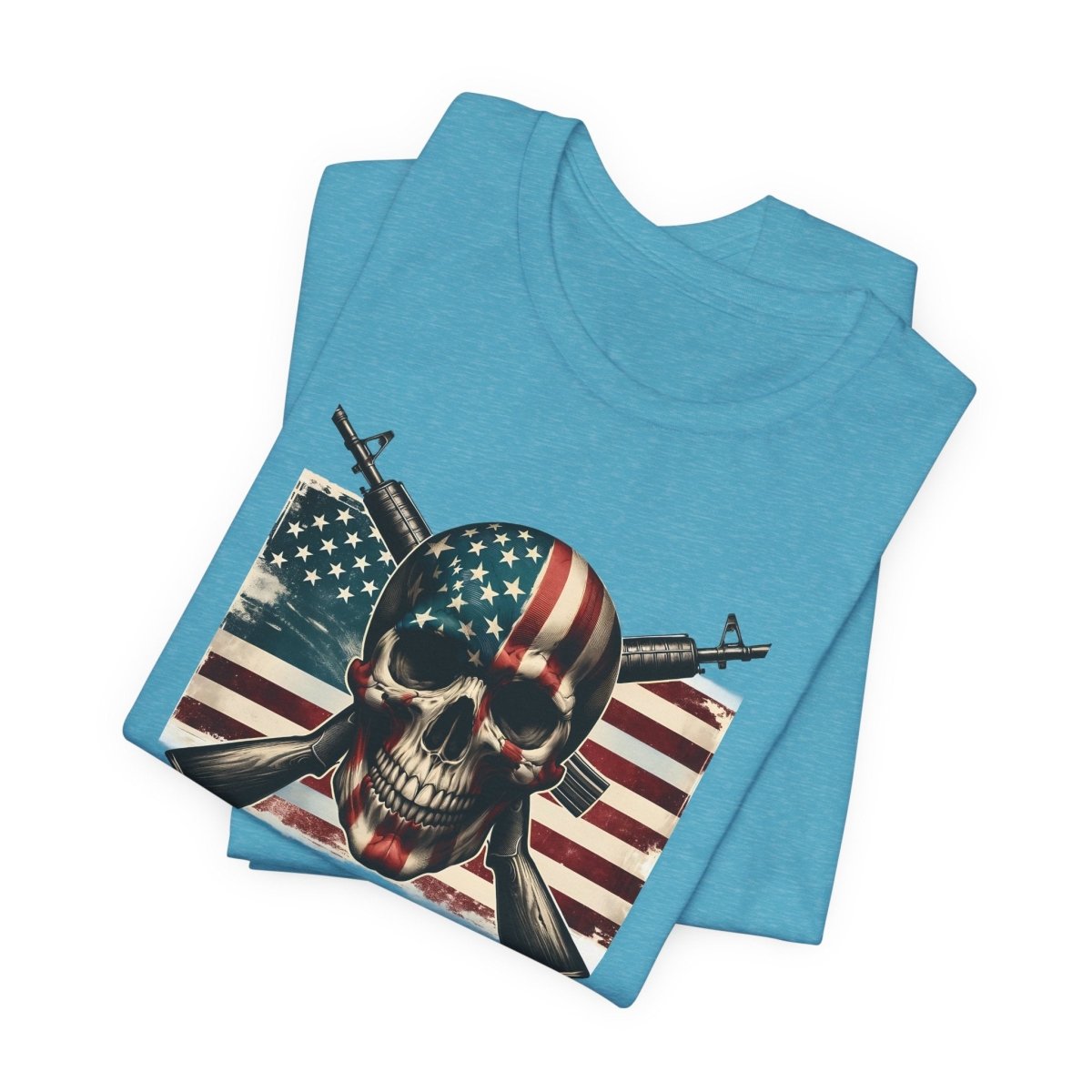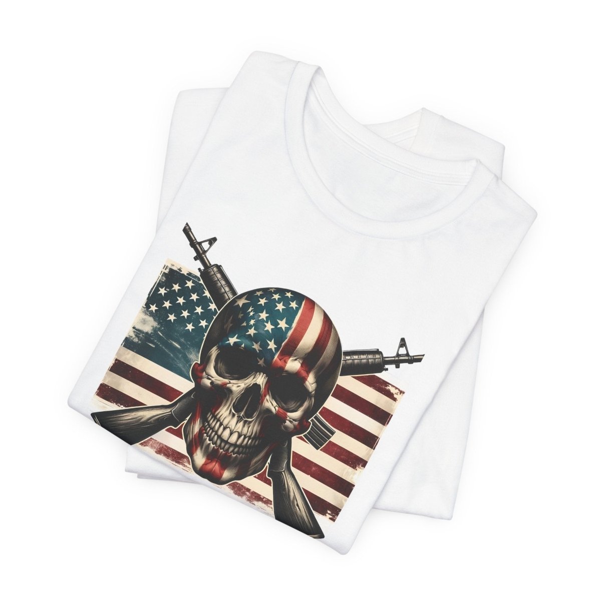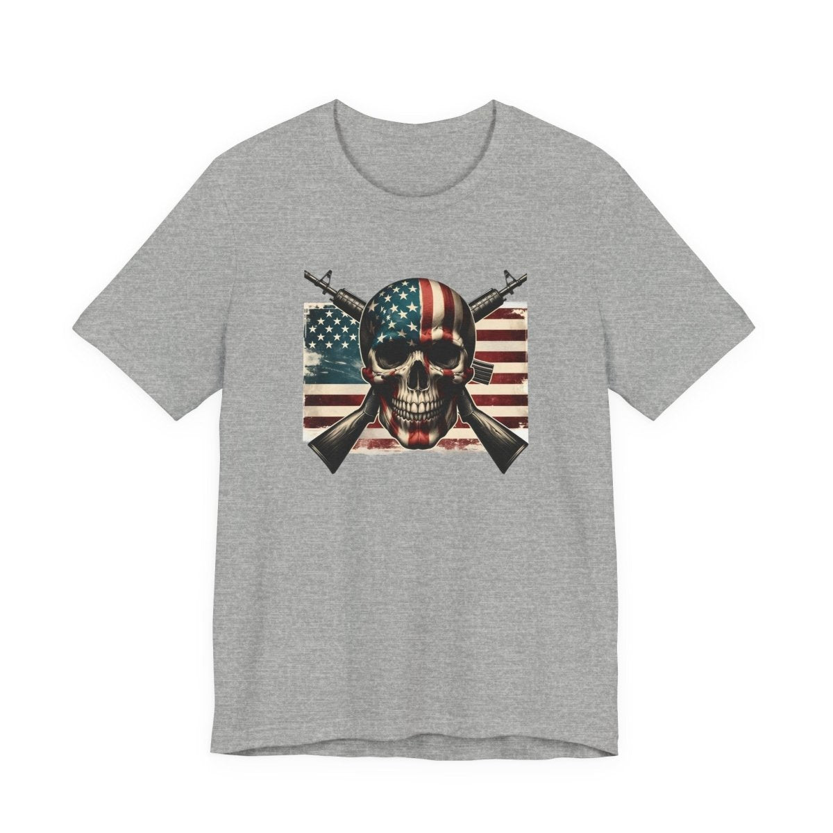 Embrace bold style and fearless freedom with this Unisex Jersey Short Sleeve Tee, featuring a striking skull wrapped in the American flag with crossed rifles. Perfect for making a statement on Independence Day, Veterans Day, or any day you're feelin’ that red, white, and rebellious energy.