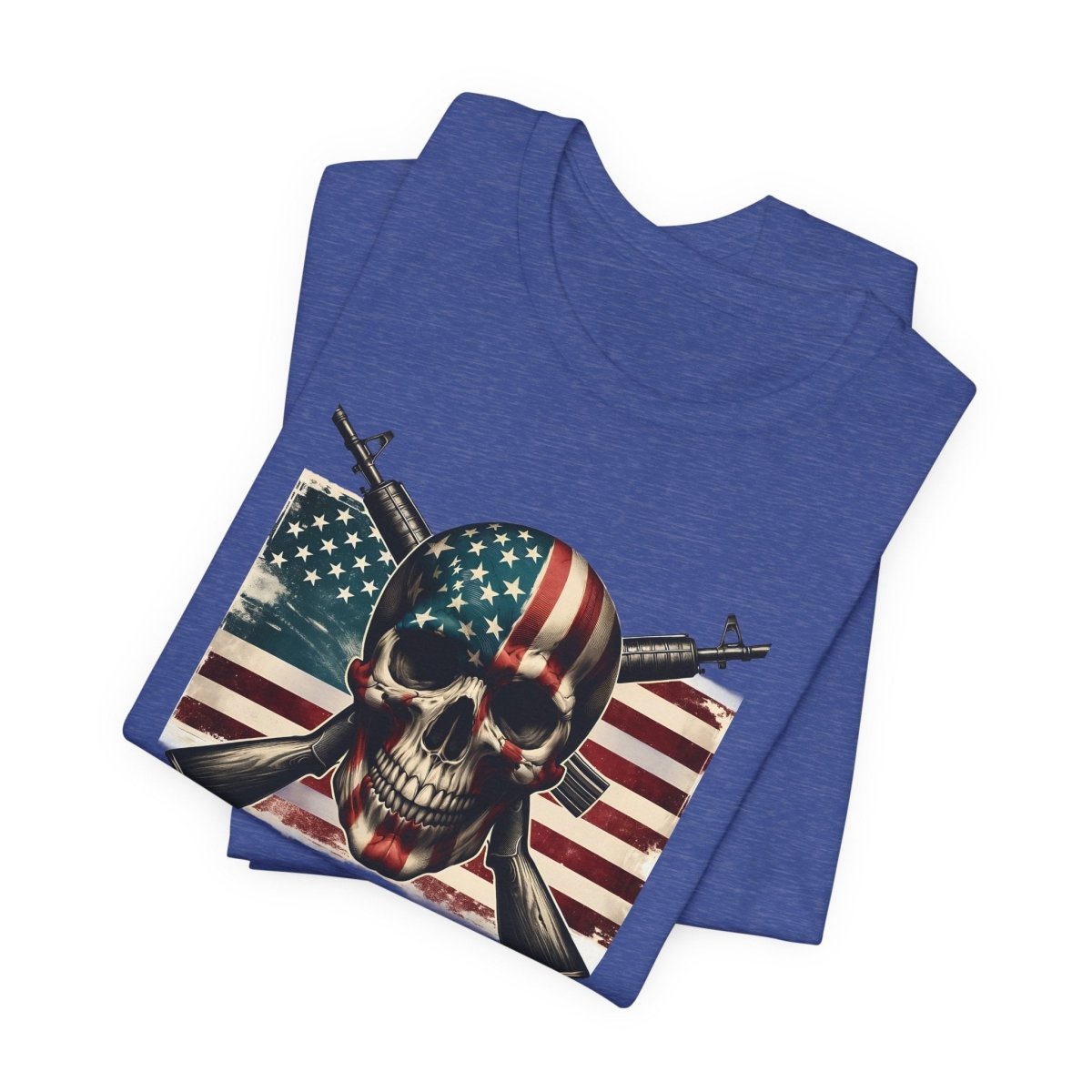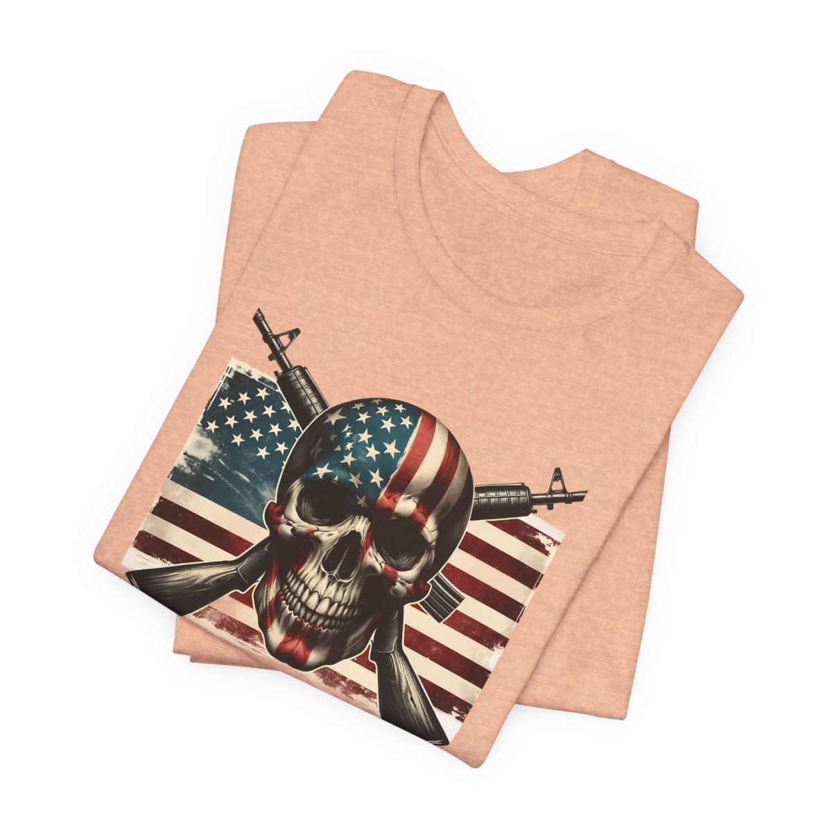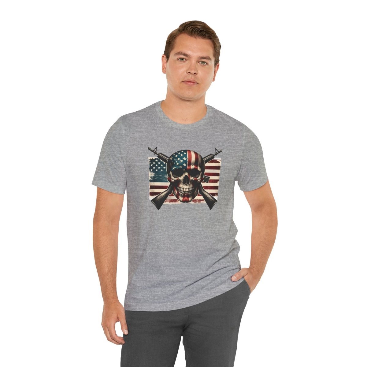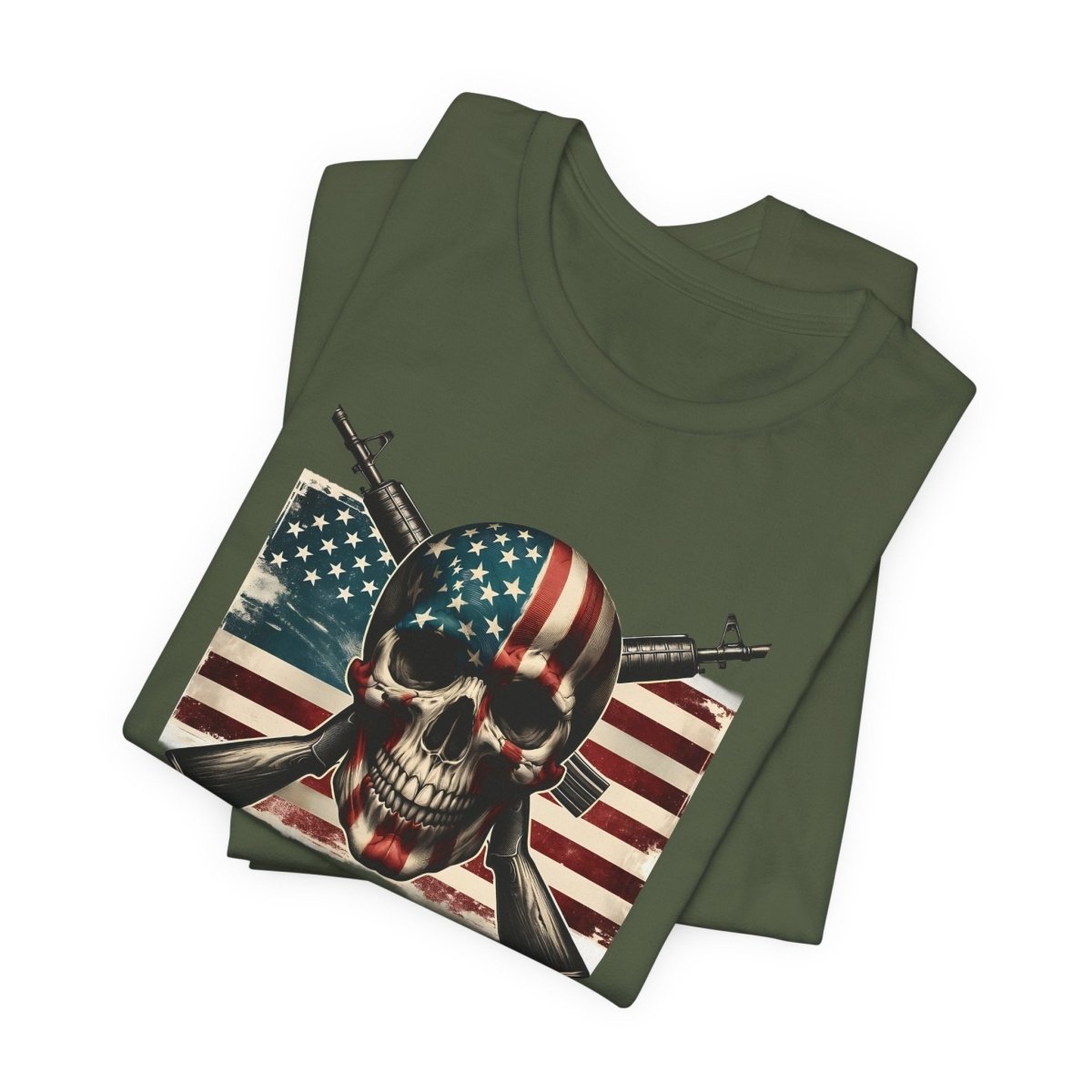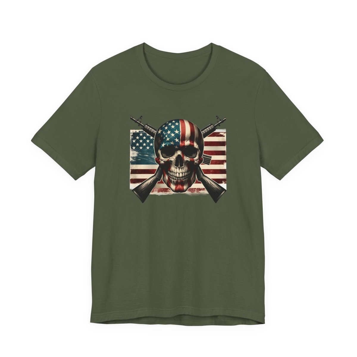 Embrace bold style and fearless freedom with this Unisex Jersey Short Sleeve Tee, featuring a striking skull wrapped in the American flag with crossed rifles. Perfect for making a statement on Independence Day, Veterans Day, or any day you're feelin’ that red, white, and rebellious energy.