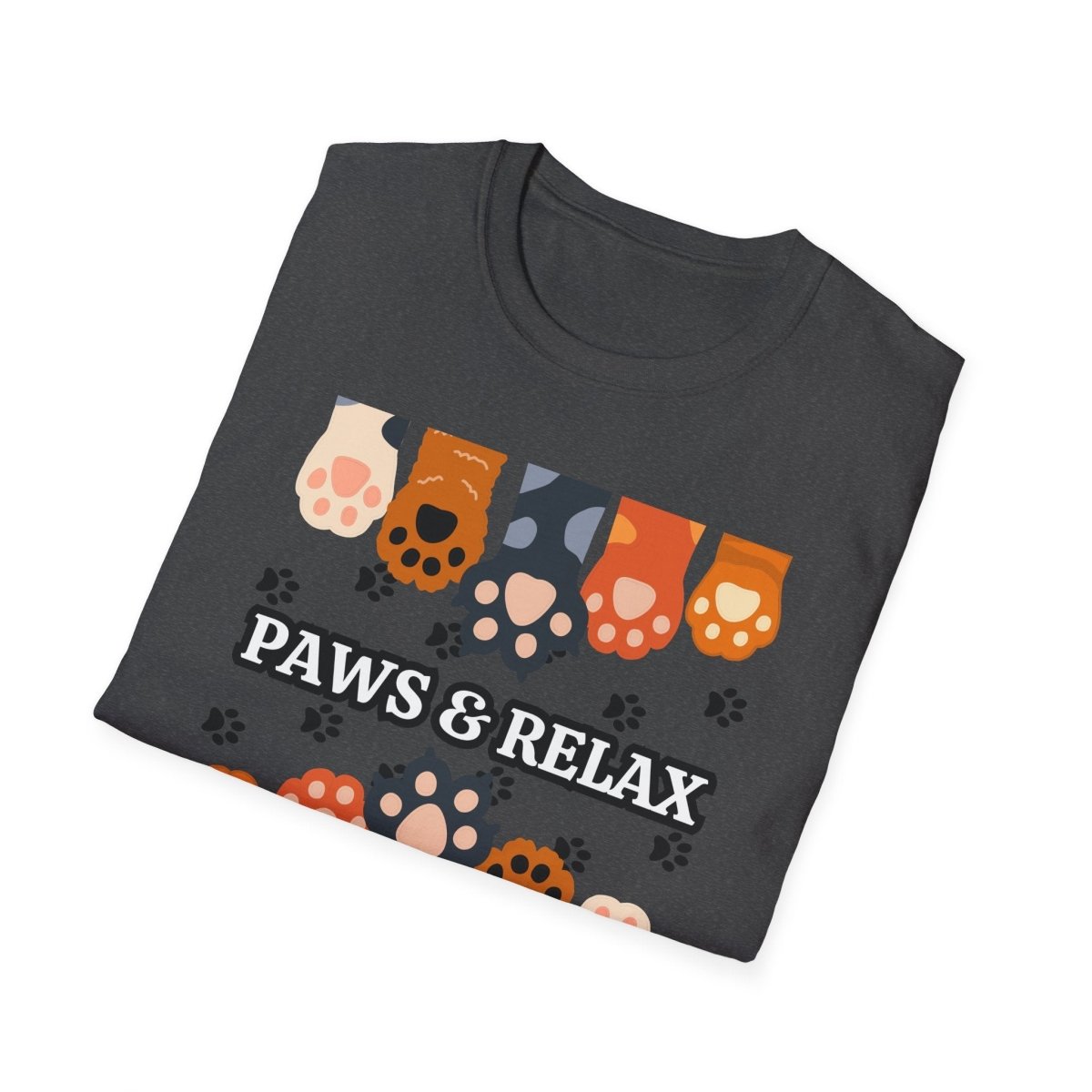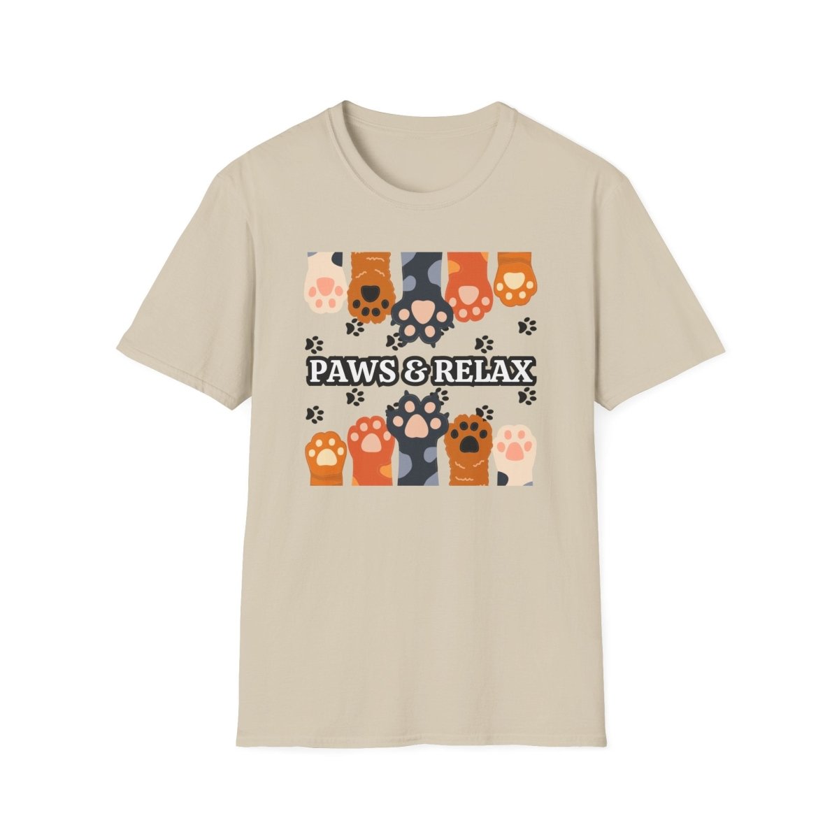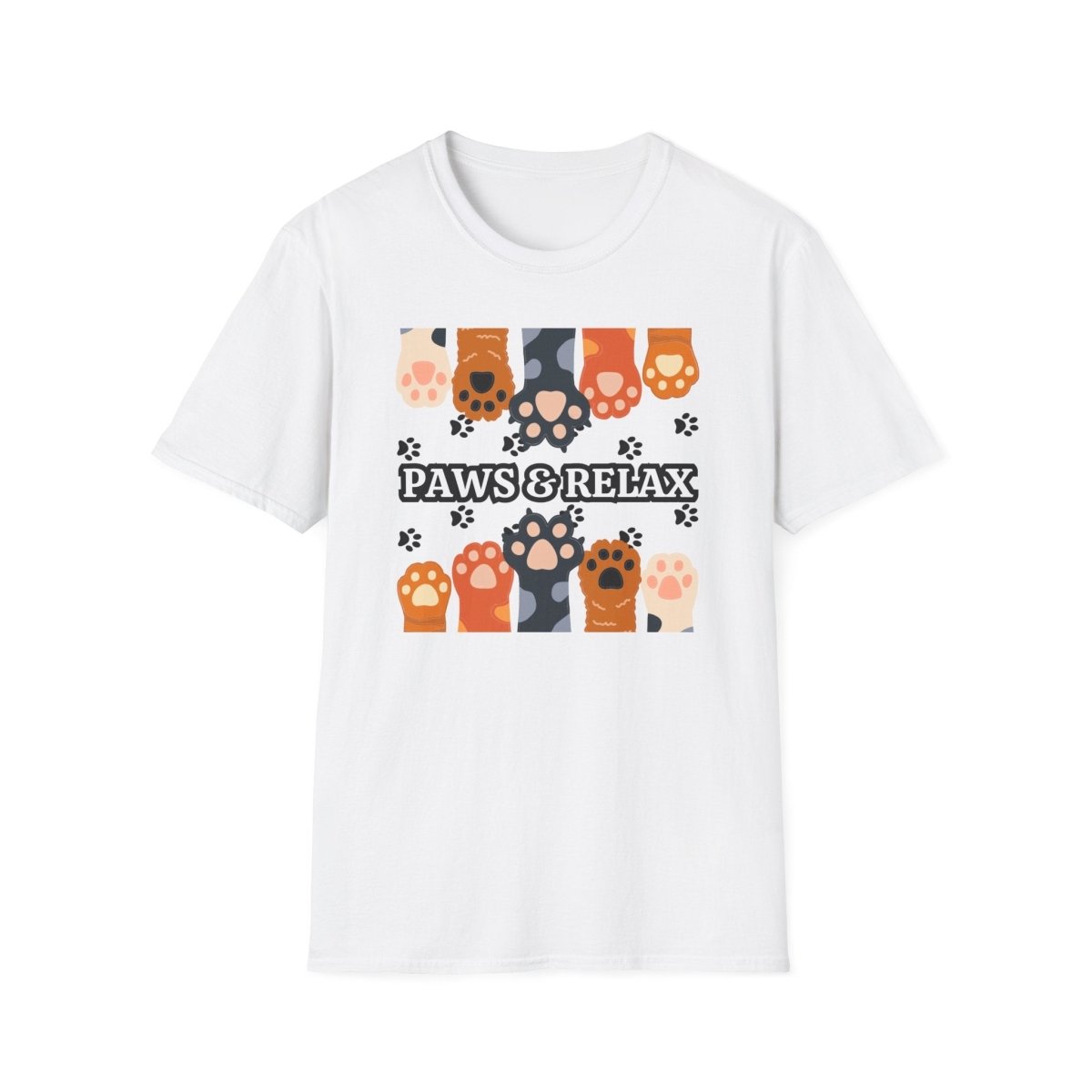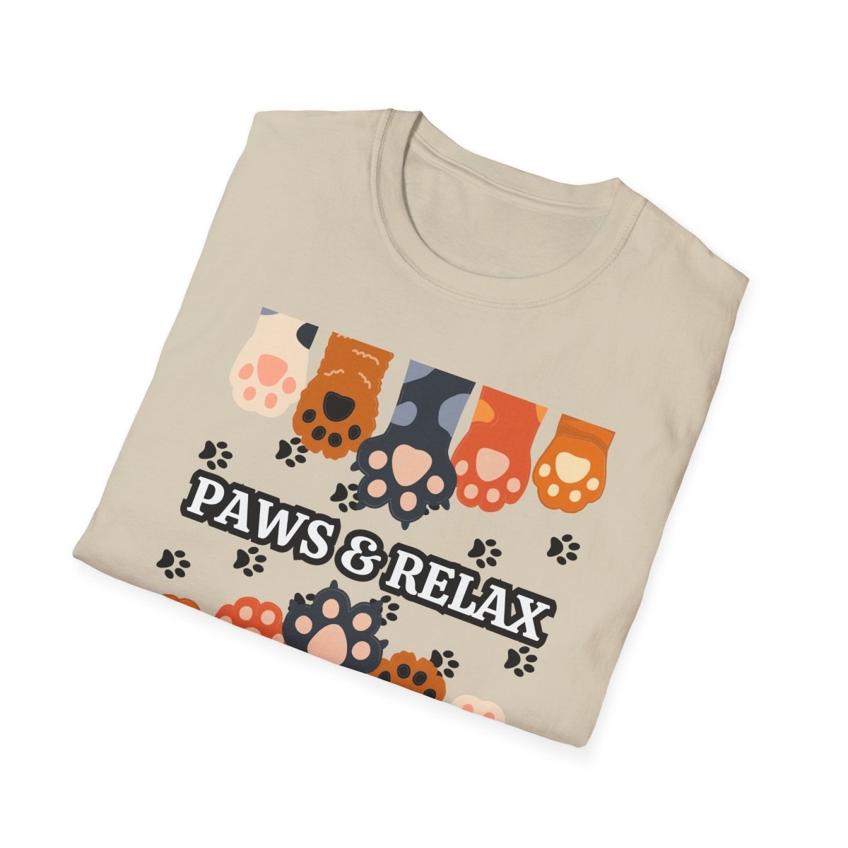 A cozy unisex T-shirt featuring a cute 'Paws & Relax' design. Perfect for animal lovers looking to unwind and relax in style. This T-shirt is ideal for casual outings and lounging at home. Great for pet owners and those who appreciate a laid-back vibe. Suitable for holidays like National Pet Day.