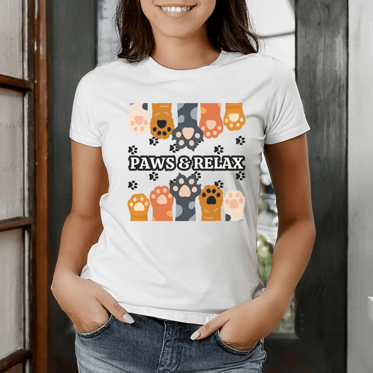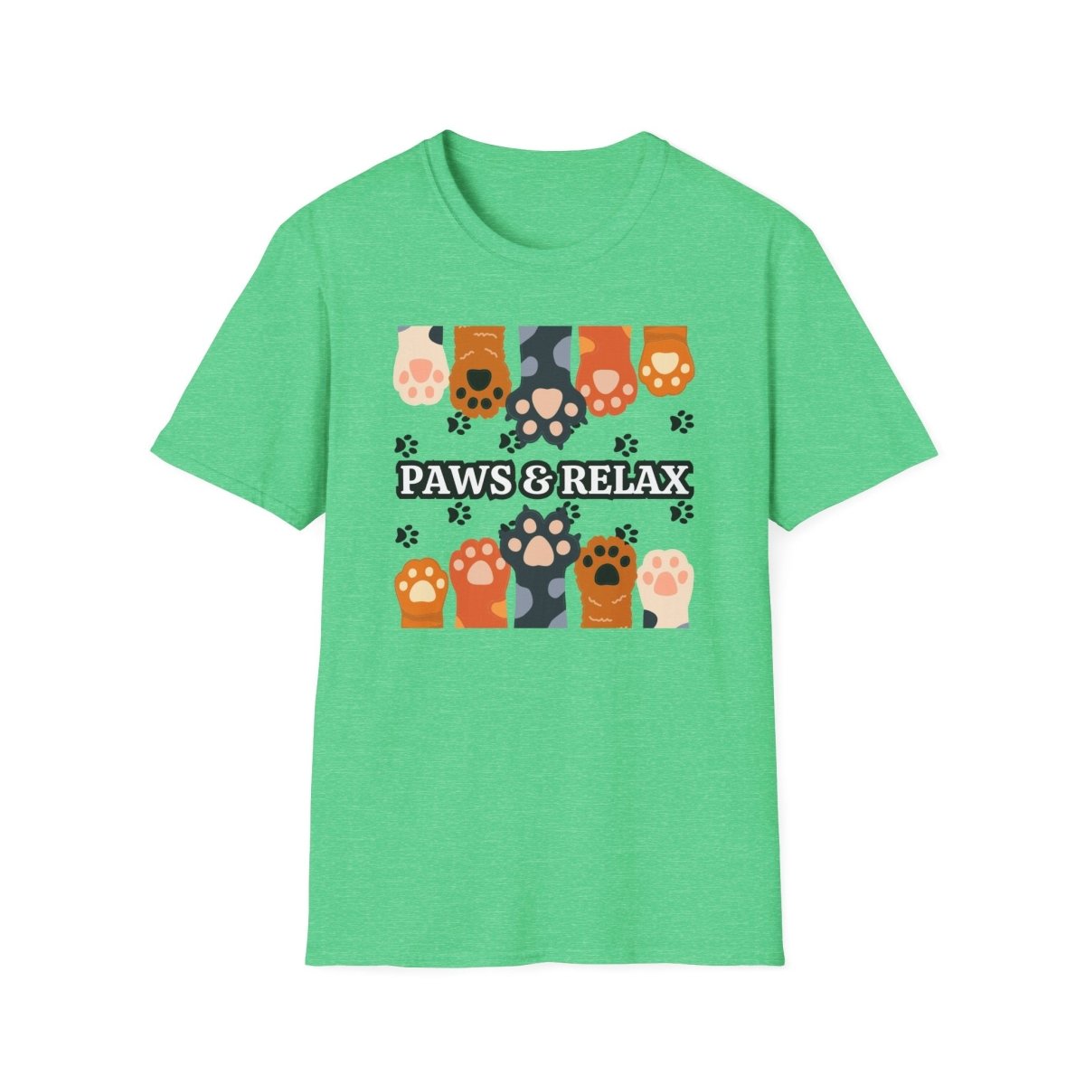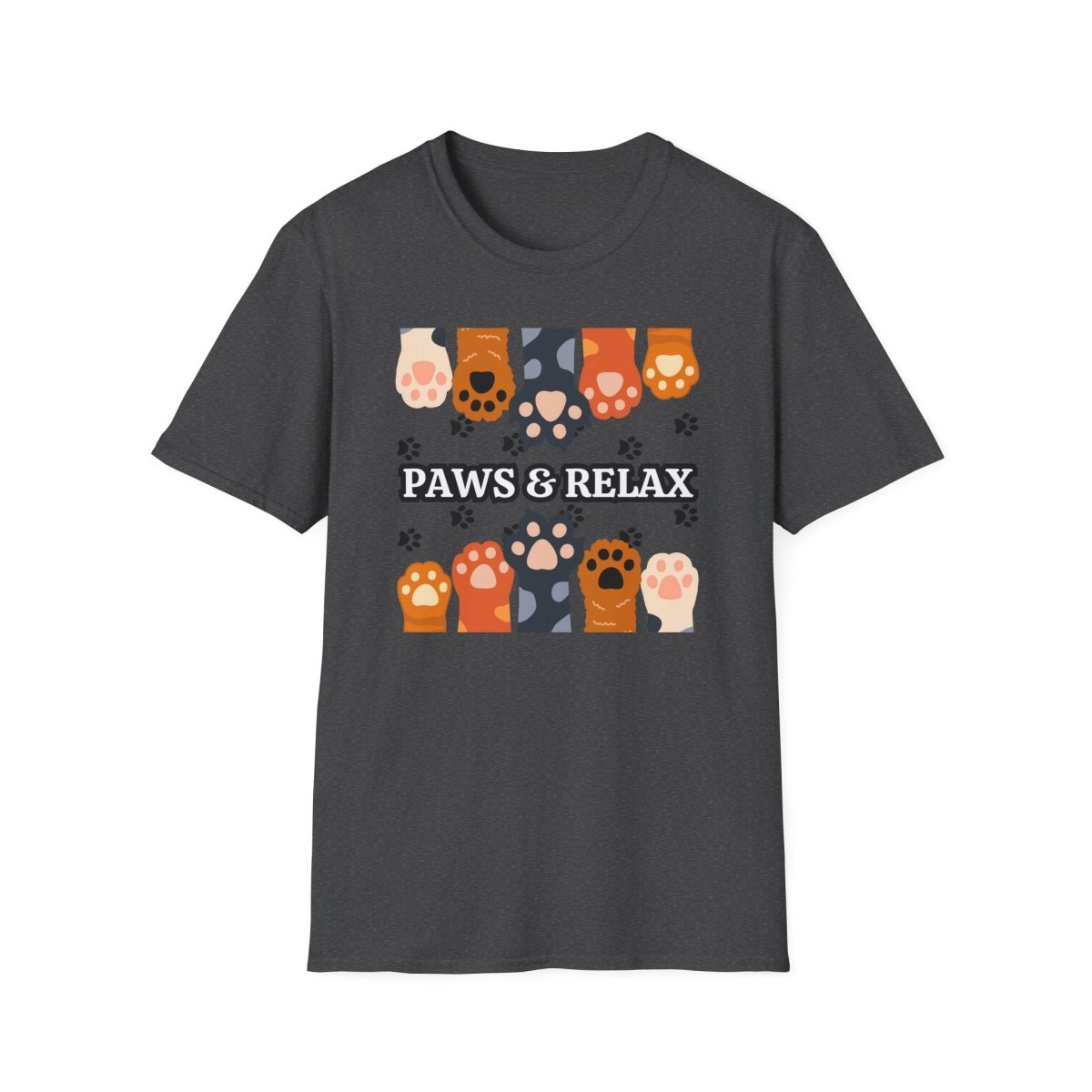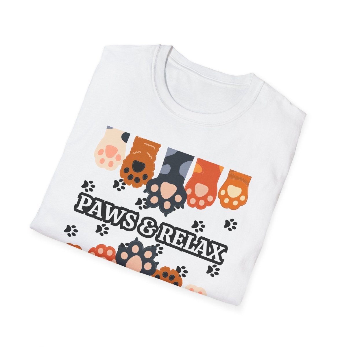 A cozy unisex T-shirt featuring a cute 'Paws & Relax' design. Perfect for animal lovers looking to unwind and relax in style. This T-shirt is ideal for casual outings and lounging at home. Great for pet owners and those who appreciate a laid-back vibe. Suitable for holidays like National Pet Day.
