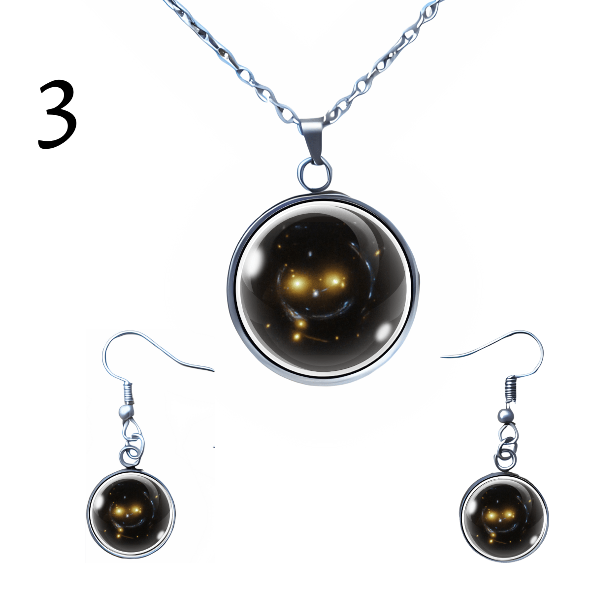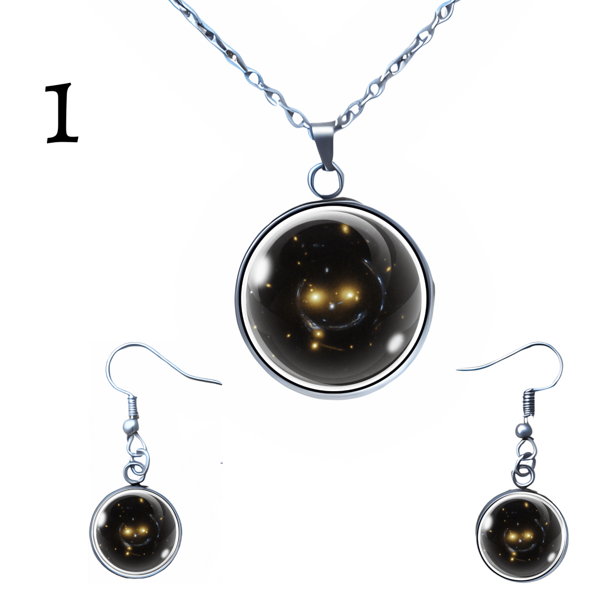 Take a little piece of the universe wherever you go with this playful jewelry set featuring the Smiley Face Galaxy—aka SDSS J1038+4849, the happiest galaxy cluster in the cosmos. Located 4.5 billion light-years away in the constellation Ursa Major, this real-life smile in the stars is now yours to wear.