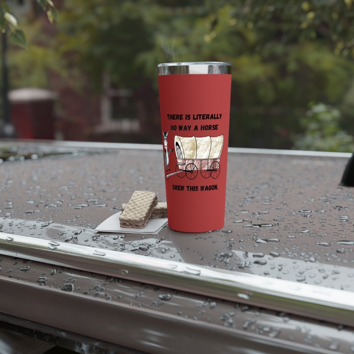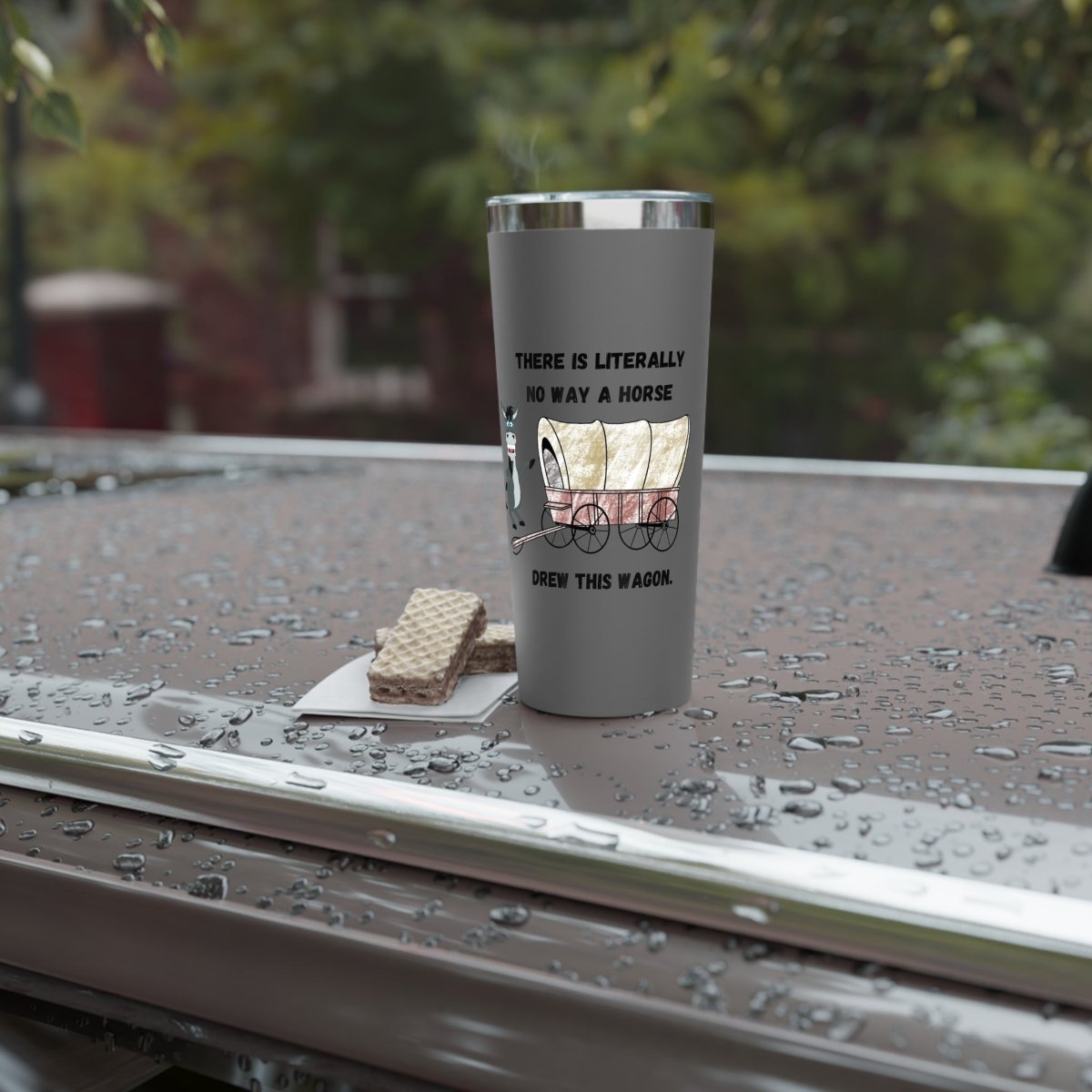 This copper vacuum insulated tumbler features a humorous design with the phrase 'there's literally no way a horse drew this wagon'. It keeps your drinks warm for 6 hours and cold for 24 hours, making it perfect for daily use or on-the-go. The spill-resistant, see-through push-on lid is versatile for both hot and cold beverages. Relevant for horse lovers, humor enthusiasts, and anyone looking for a fun and functional tumbler. Ideal for birthdays, holidays, or as a unique gift.