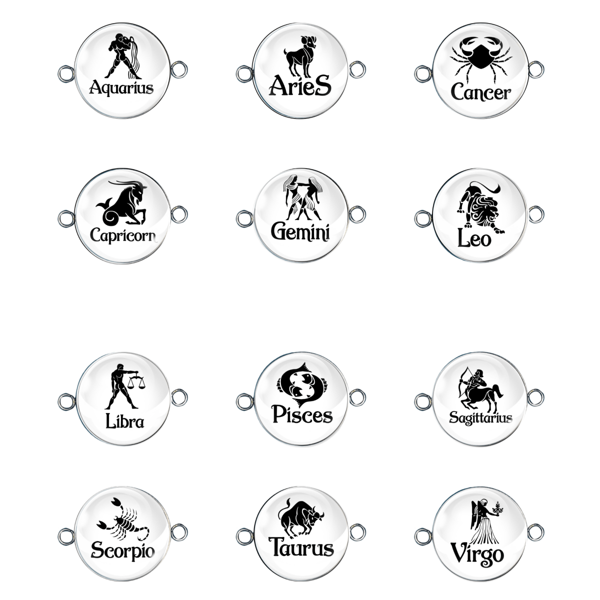 Elevate your style with our Zodiac 2 Hoop Bracelet Charms. Handmade in the USA with crystal clear glass cabochons, these charms boast a never-fade stainless steel base in a sleek Silver color. Perfect for bracelets, necklaces, and crafts, each charm features 2 hoops for endless customization possibilities.