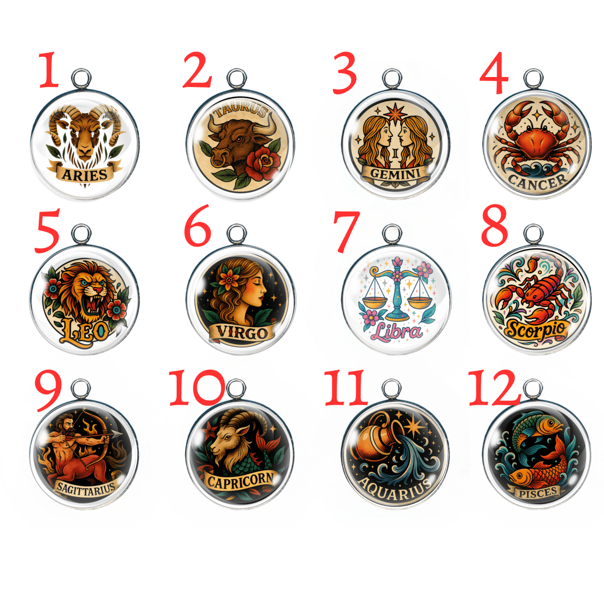 Zodiac Tattoo Charms – Bold, Celestial Astrology Cabochon Pendants